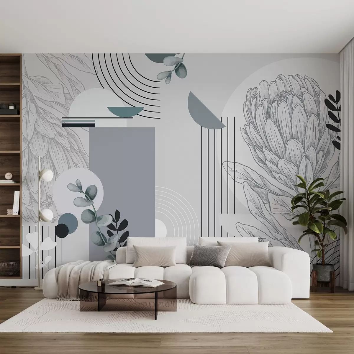 Fototapety Abstraktná botanická potlač s kvetom protey, eukalyptovými listami, geometrickými tvarmi v minimalistickom štýle, pastelové farby Nr. w08914v1
