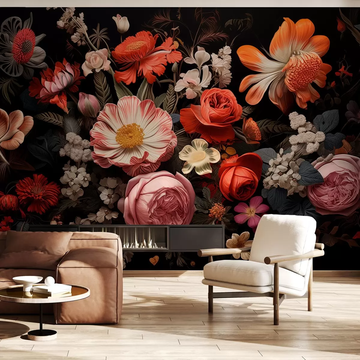 Fototapety Farebná kytica rôznych kvetov na tmavom pozadí v teplých tónoch Nr. w08969