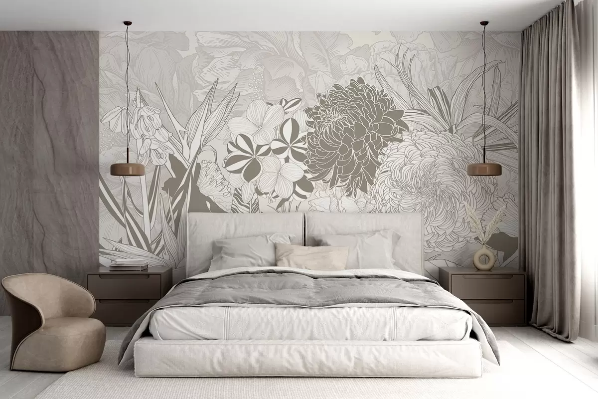 Fototapety Kvety a listy v béžových tónoch vrátane chryzantém, plumérie a tropického lístia, botanický dizajn Nr. w08976