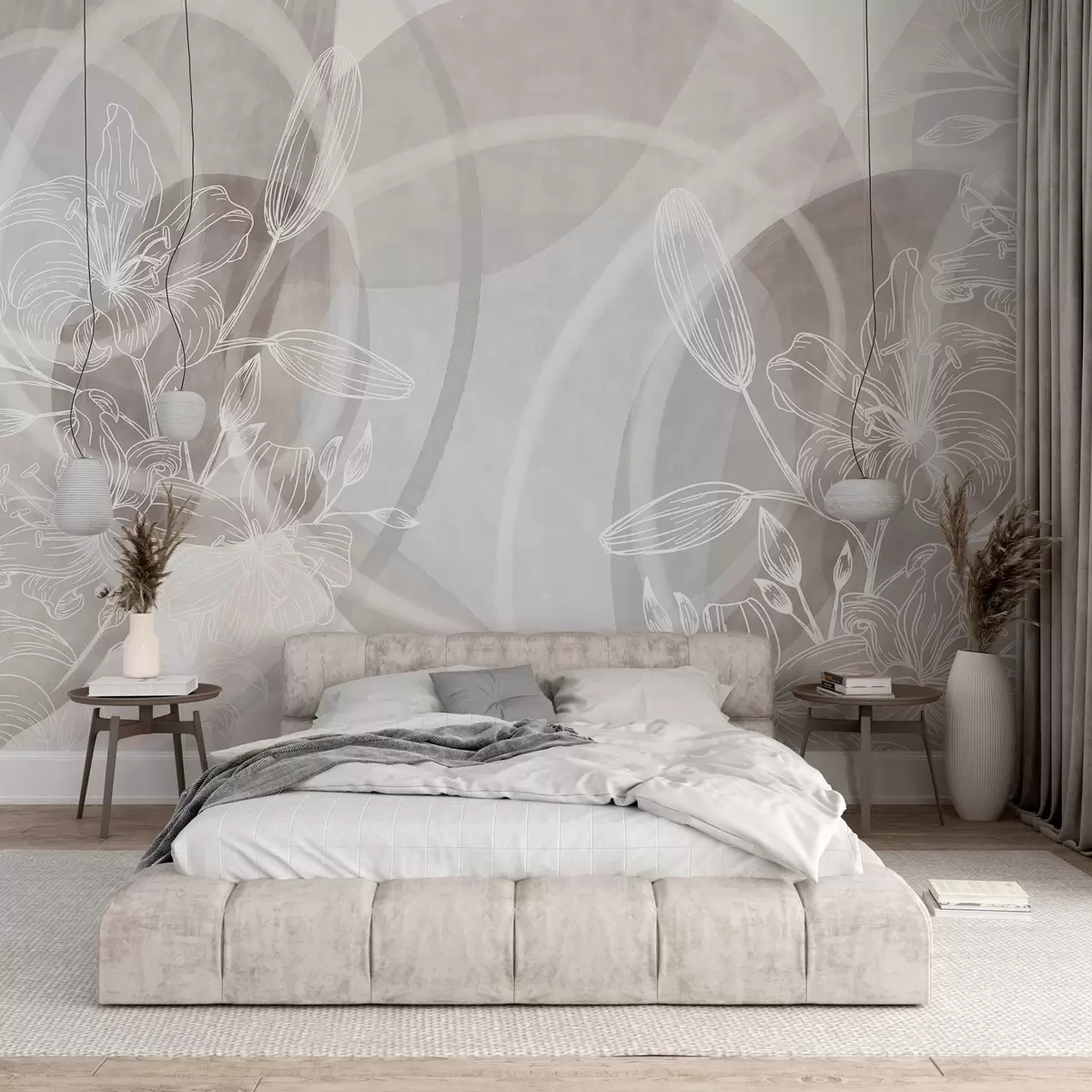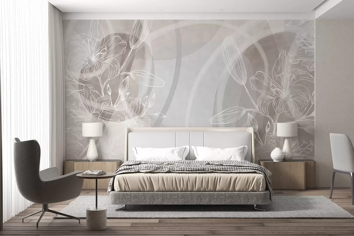 Fototapety Minimalistický kvetinový dizajn s bielymi líniovými kvetmi a listami, prekrývajúcimi sa abstraktnými kruhmi v béžových a modrých odtieňoch Nr. w08979v1