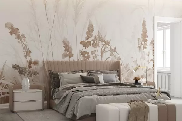 Fototapety Hnedé kvety a béžové trstiny v poli, minimalistická maliarska štruktúra, svetlé pozadie, jemné farby, jemné ťahy štetcom Nr. w08982v1