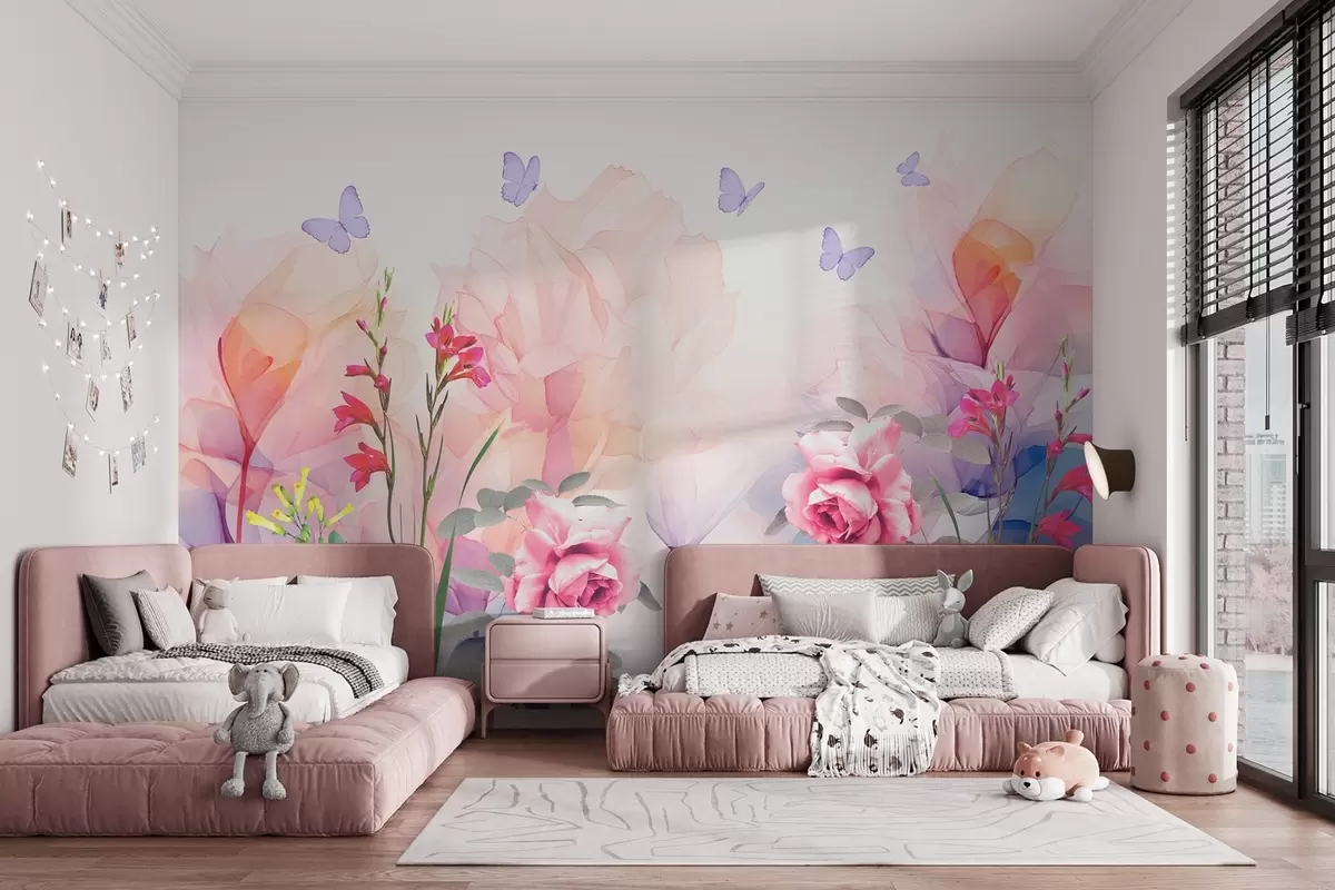 Fototapety Kvety s motýľmi a ružami v akvarelovom štýle Nr. w09002