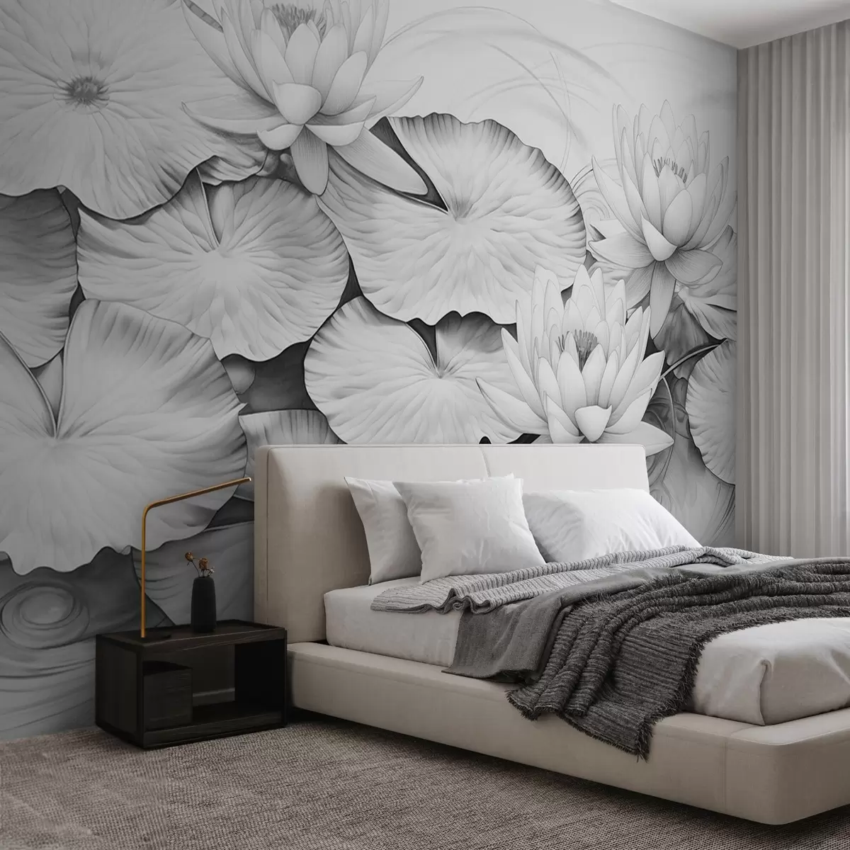Fototapety Lekná a lekná v rybníku, čiernobiela imitácia kresby ceruzkou, detailná botanická ilustrácia, prírodné umenie Nr. w09006