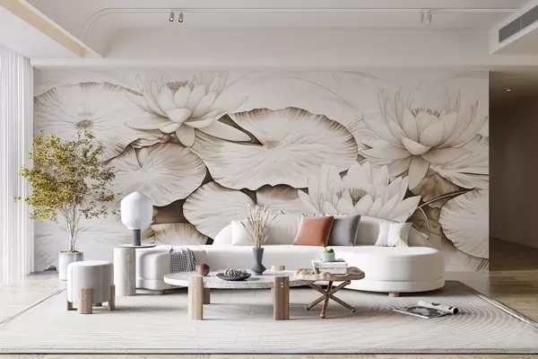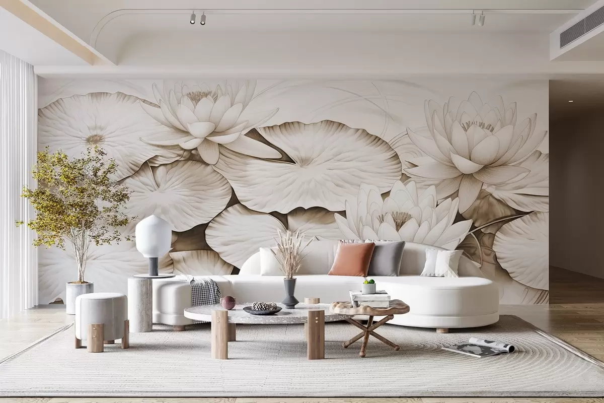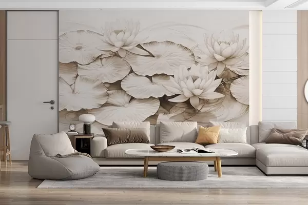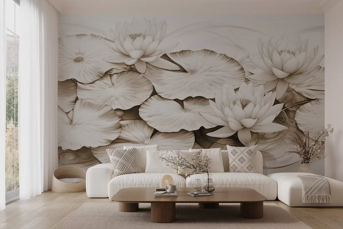 Fototapety Lekná a lekná v rybníku, hnedá a biela imitácia kresby ceruzkou, detailná botanická ilustrácia, prírodné umenie Nr. w09006v2