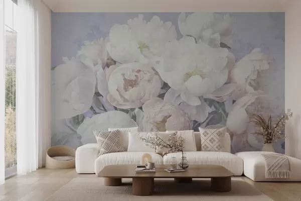 Fototapety Textúrované abstraktné broskyňové a biele pivonky so zelenými listami, svetlé pozadie, jemné a delikátne farby, vintage štýl Nr. w09008v1