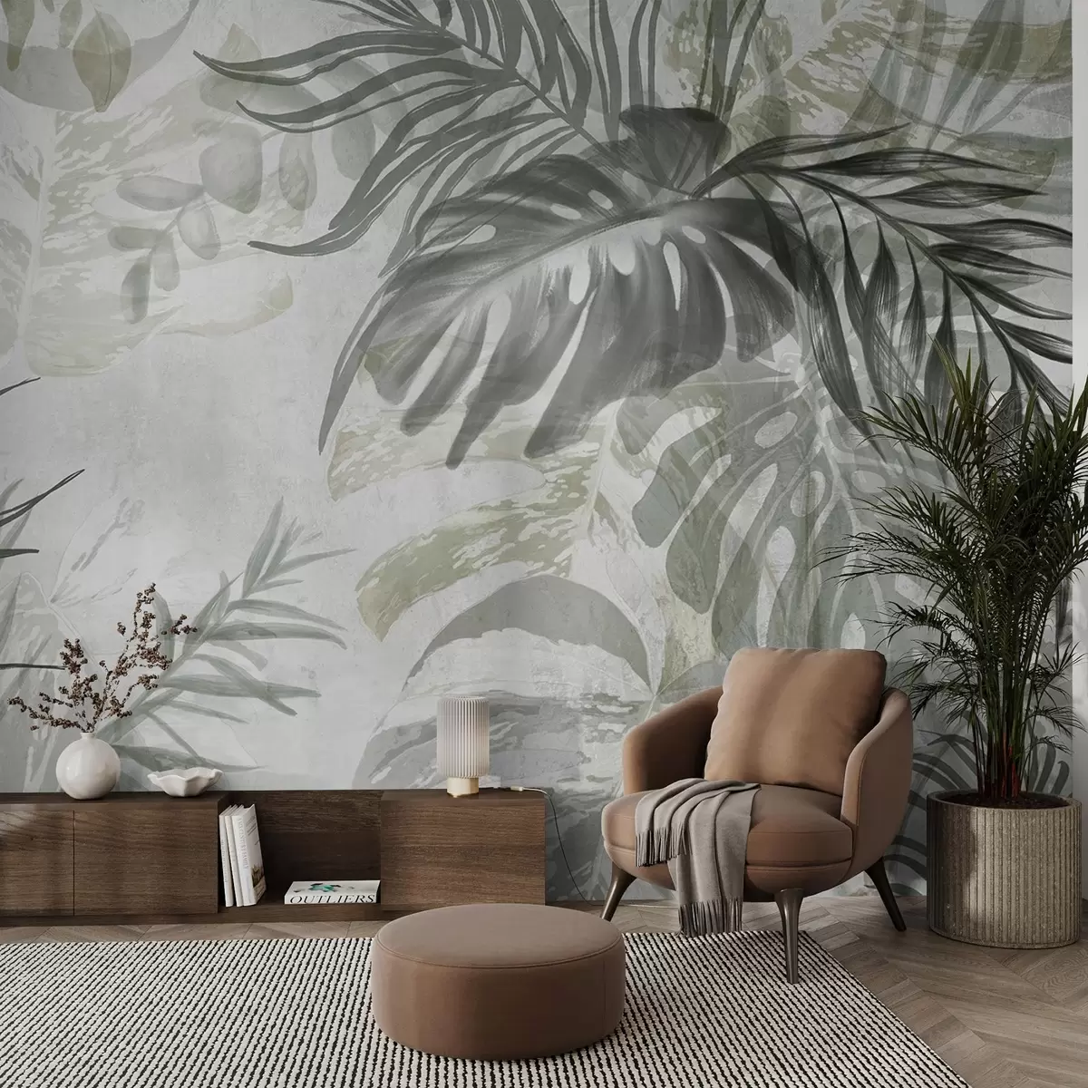 Fototapety Monstera a palmové listy v odtieňoch zelenej a sivej, botanické, tropické lístie, rastliny džungle, textúrované pozadie Nr. w09011