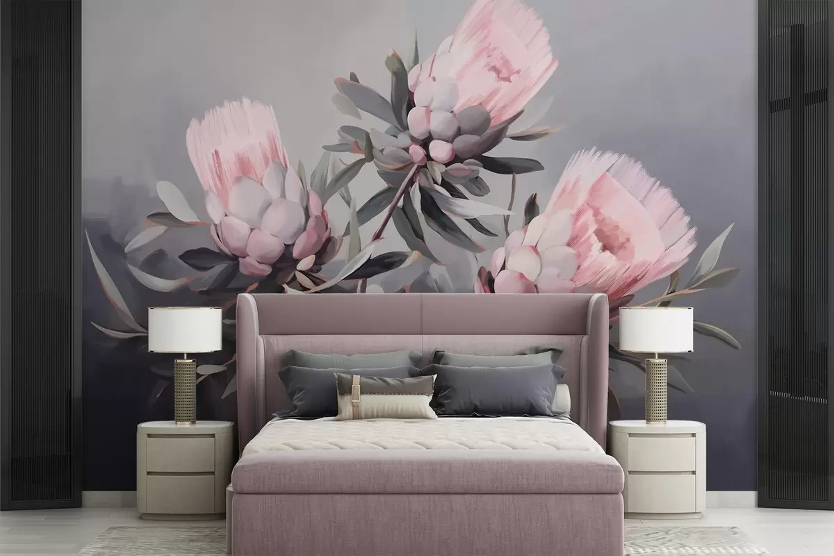 Fototapety Ružové protea abstraktné kvety so sivými listami, mäkké textúrované ťahy štetcom, tlmené farby, na rozmazanom sivom pozadí Nr. w09014