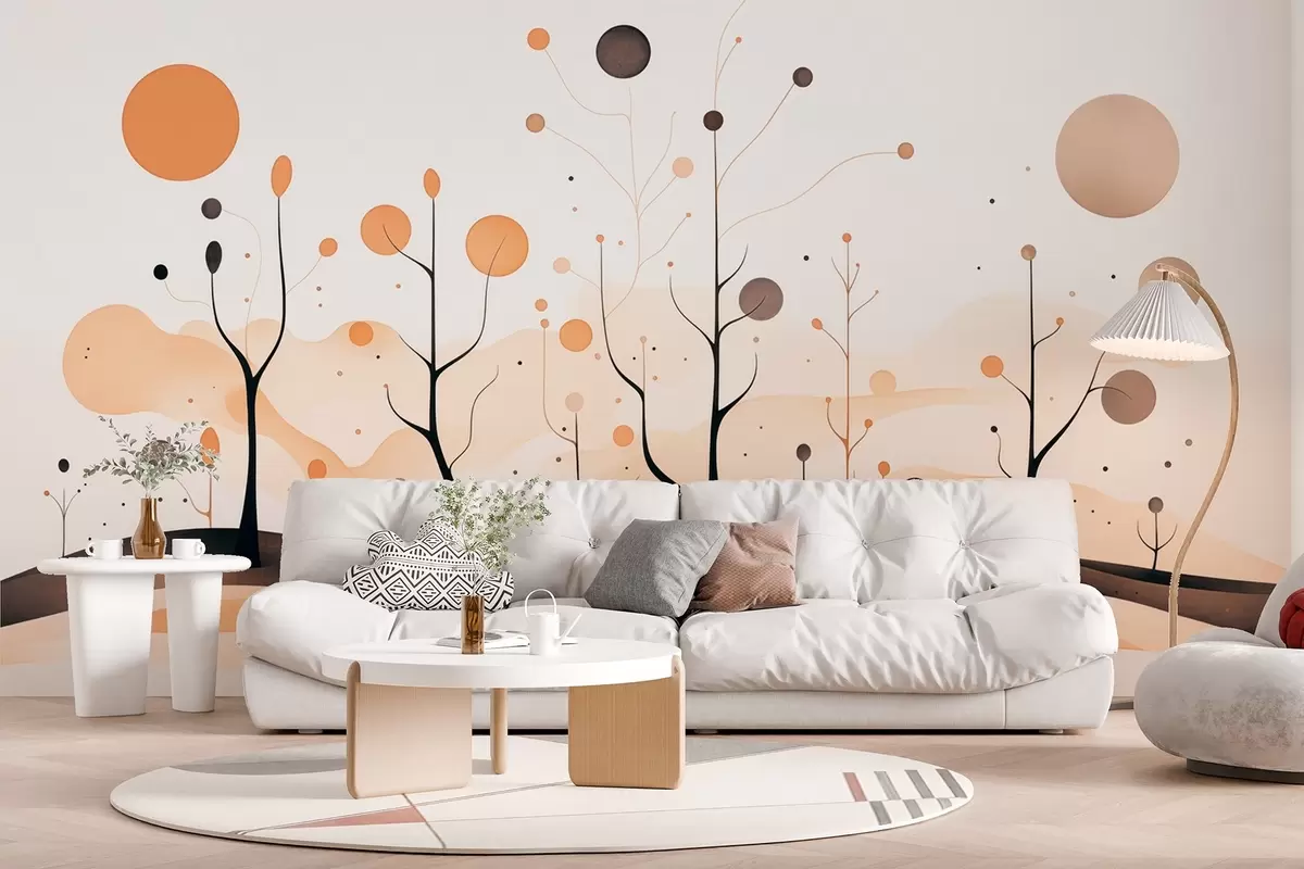 Fototapety Abstraktné stromy s guľami a slnkom v béžovo-sivých tónoch Nr. w09043
