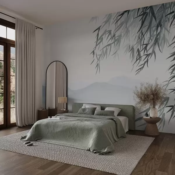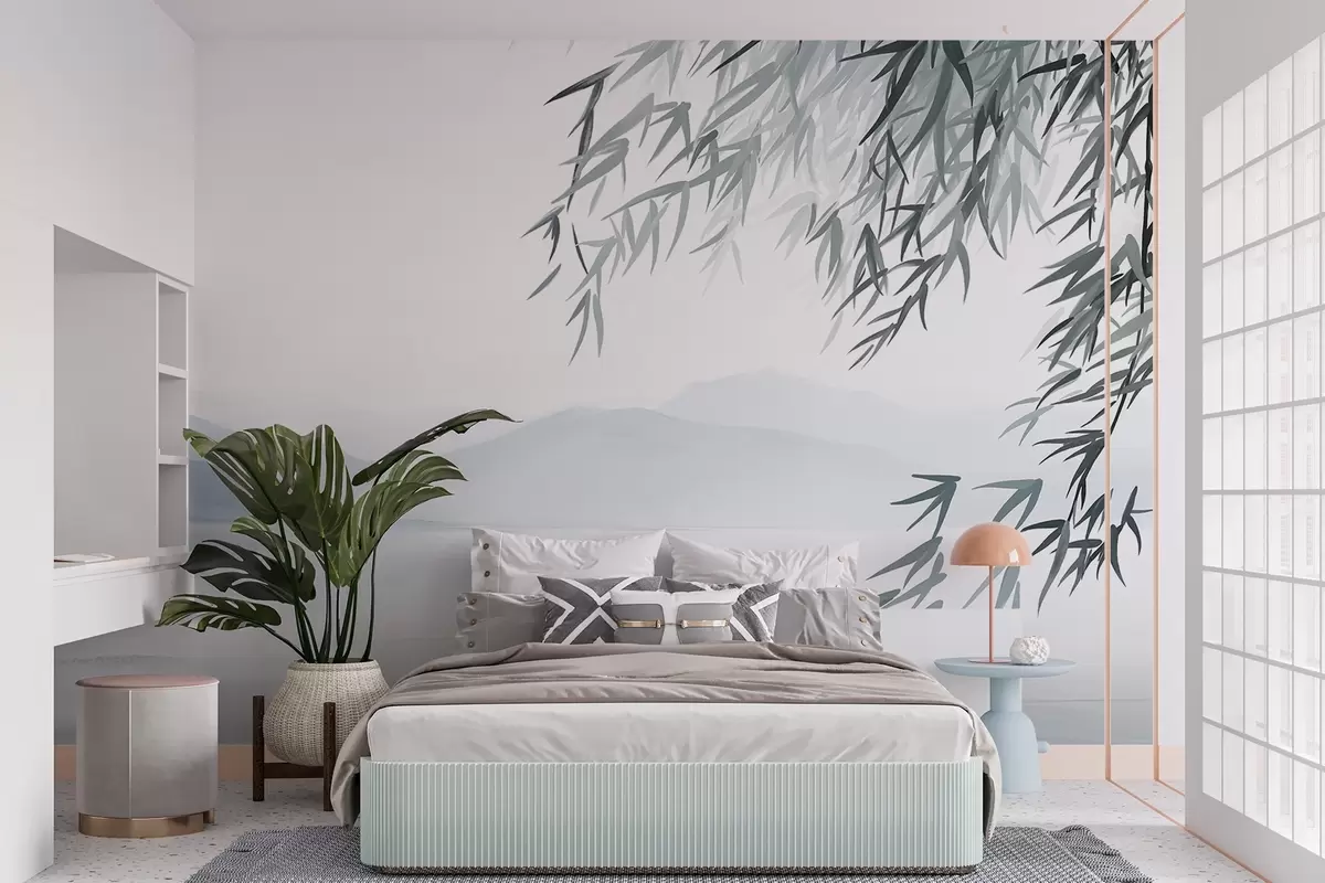 Fototapety Bambusové listy visiace nad jazerom s horami v pozadí, jemné modré a biele tóny, štýl maľby vymývaním tušom Nr. w09048