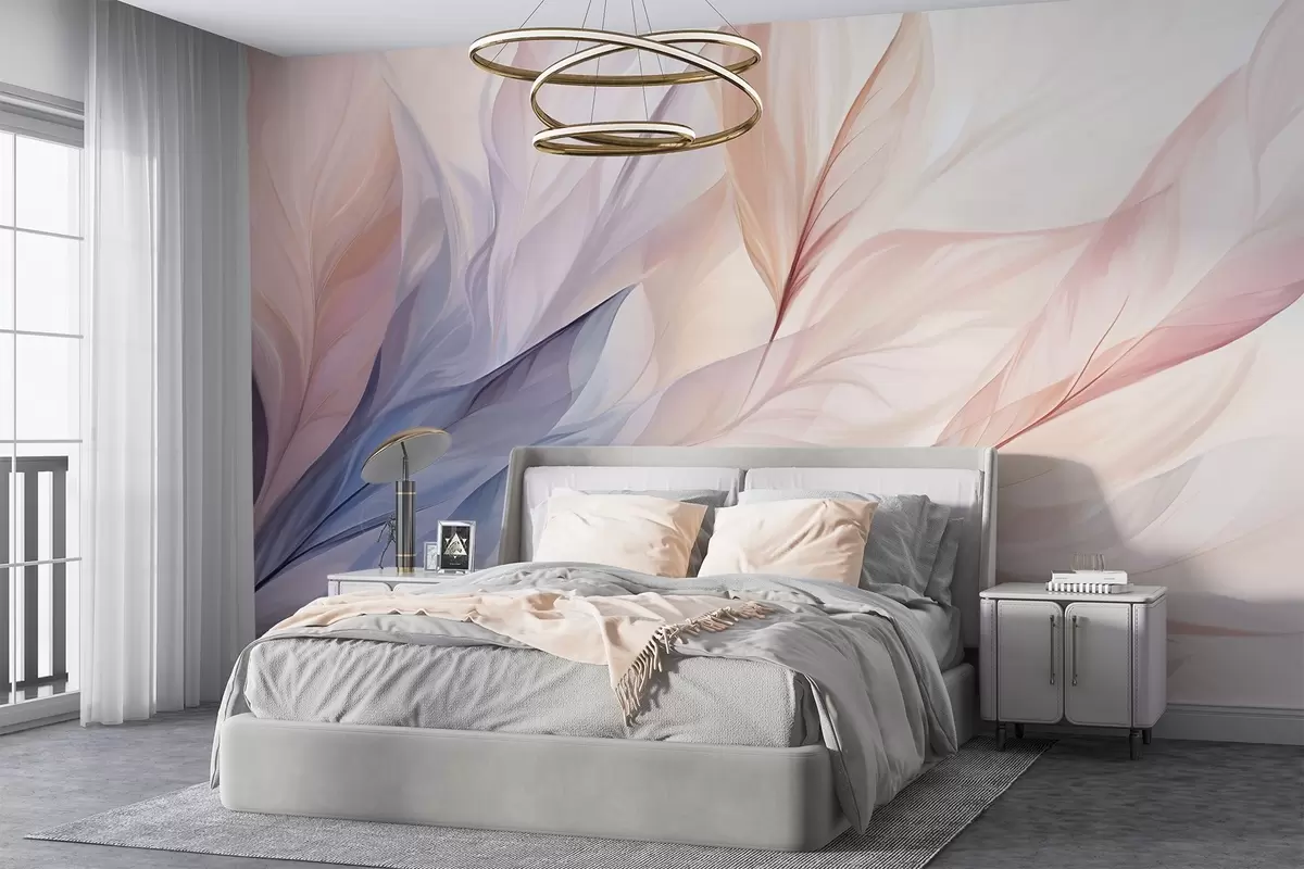 Fototapety Abstraktný kvetinový dizajn so splývavými okvetnými lístkami v pastelových odtieňoch ružovej, broskyňovej a modrej farby, ktoré vytvárajú jemnú a zasnenú kompozíciu Nr. w09049