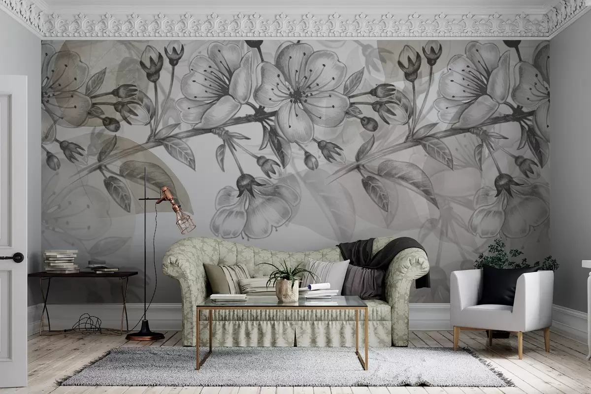 Fototapety Vetva čerešňového kvetu s kvetmi a púčikmi, sépiové tóny, mäkké akvarelové pozadie so sivými a hnedými odtieňmi Nr. w09051v1