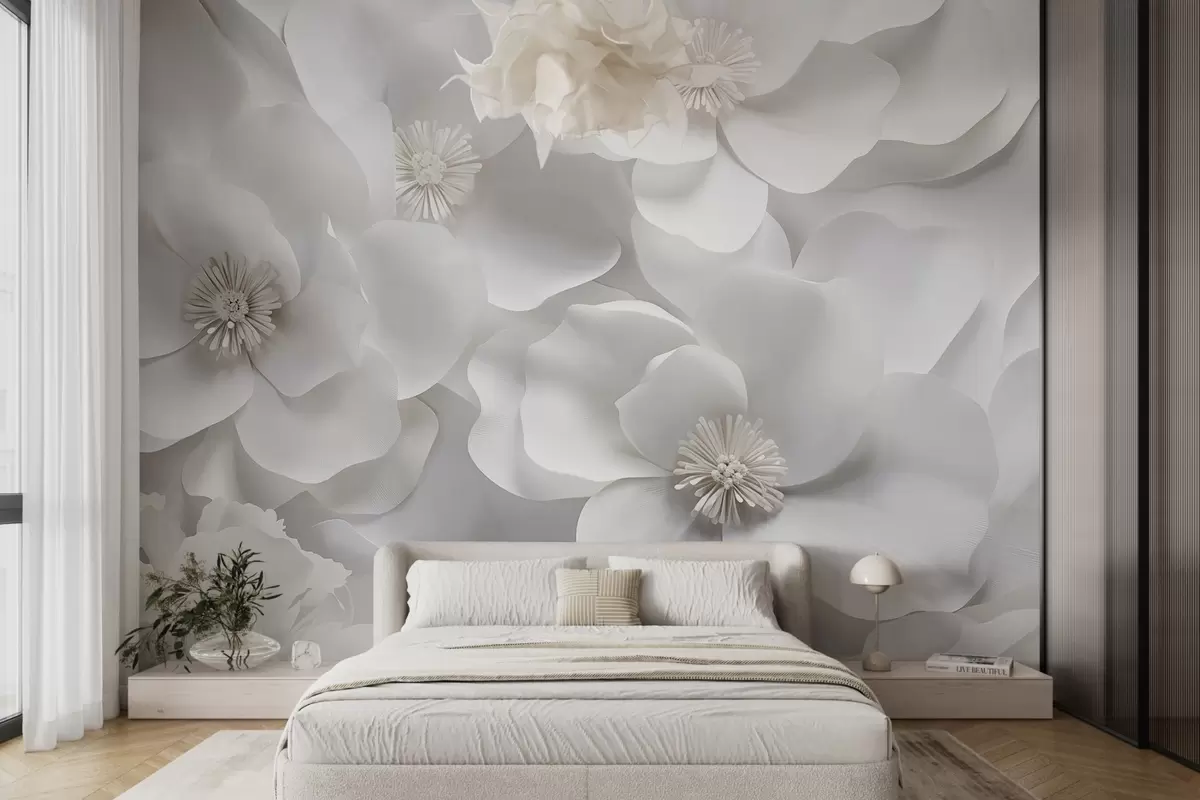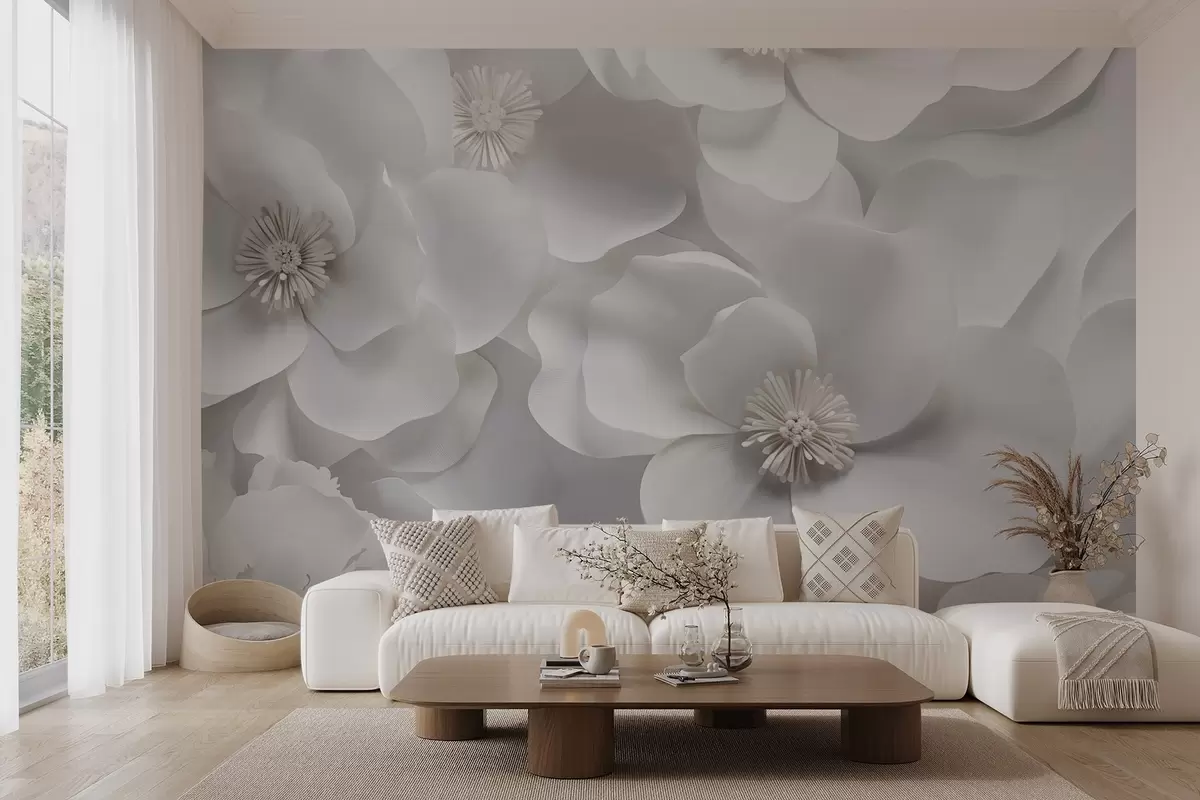 Fototapety Biele kvety s jemnými okvetnými lístkami usporiadané do hustého zhluku, ktoré vytvárajú pocit čistoty a elegancie na bielom pozadí Nr. w09053
