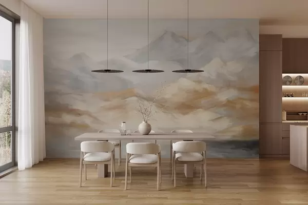 Fototapety Textúrovaná krajinomaľba hôr s jazerom v popredí v odtieňoch bielej, sivej a hnedej farby Nr. w09057