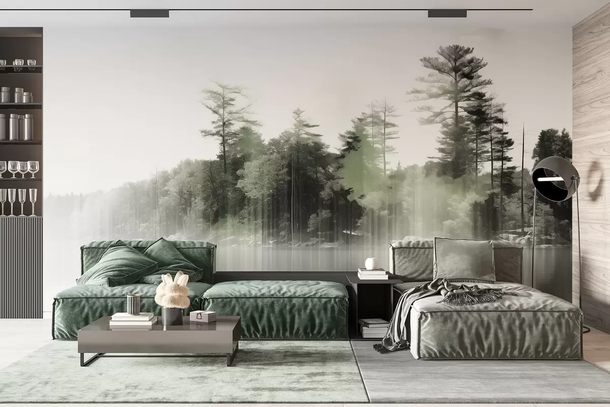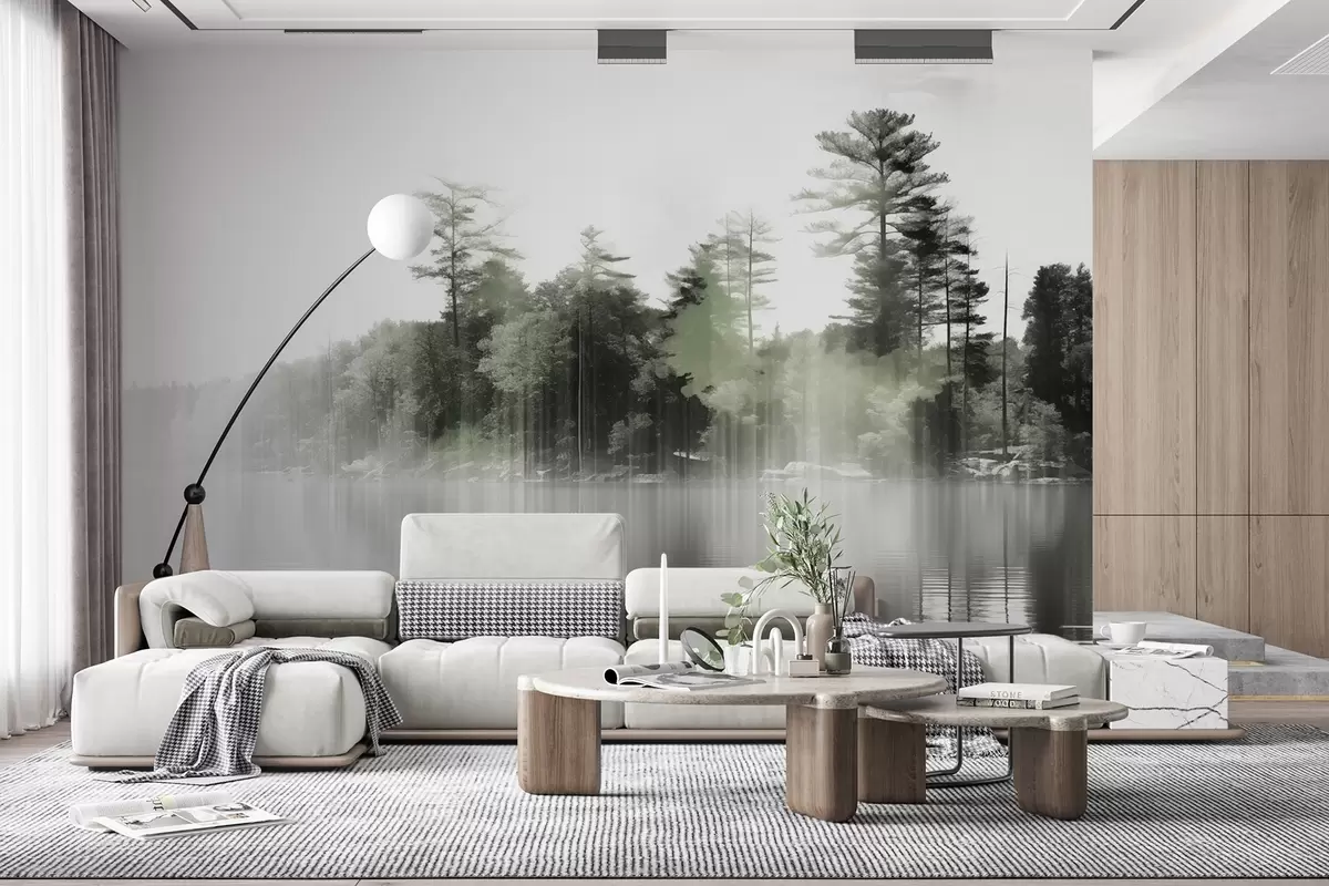 Fototapety Abstraktný minimalizmus textúrovaná krajina s jazerom a odrazmi stromov vo vode v zelených a bielych odtieňoch Nr. w09058