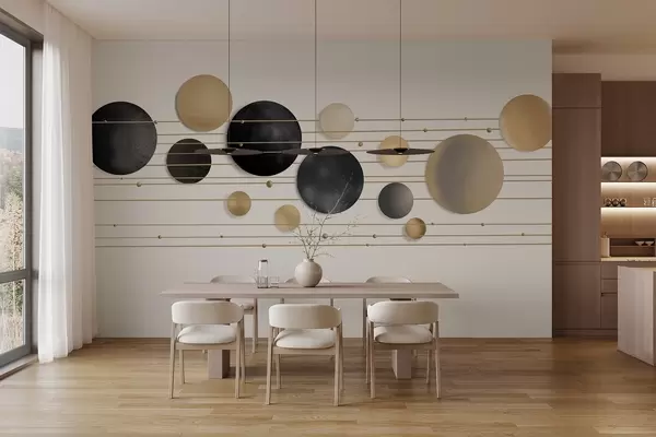 Fototapety Abstraktný moderný dizajn s textúrovanými kruhmi v bielych, žltých a sivých tónoch, ktoré sú spojené tenkými líniami, minimalistické umenie Nr. w09060