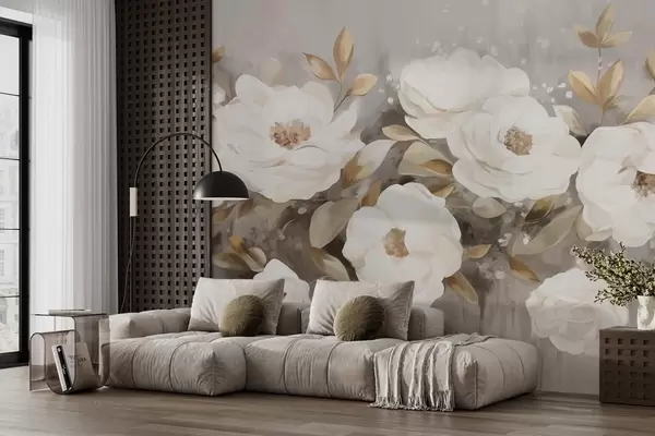 Fototapety Biele kvety so žltými listami, mäkké okvetné lístky, jemné kvetinové aranžmá, neutrálna farebná paleta, textúrované ťahy štetcom Nr. w09062