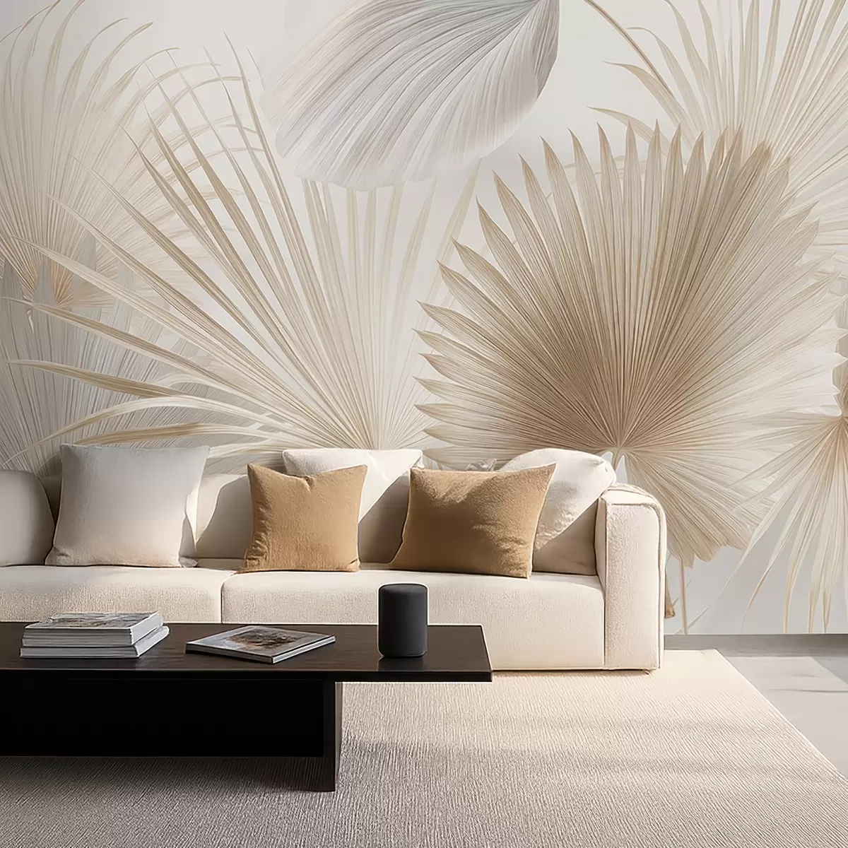 Fototapety Mäkké vejáre z tropických listov v svetlých béžových a modrastých tónoch Nr. w09084