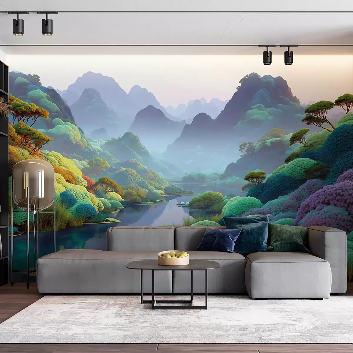 Fototapety Horská krajina s riekou v modrých tónoch so stromami a kríkmi Nr. w09088