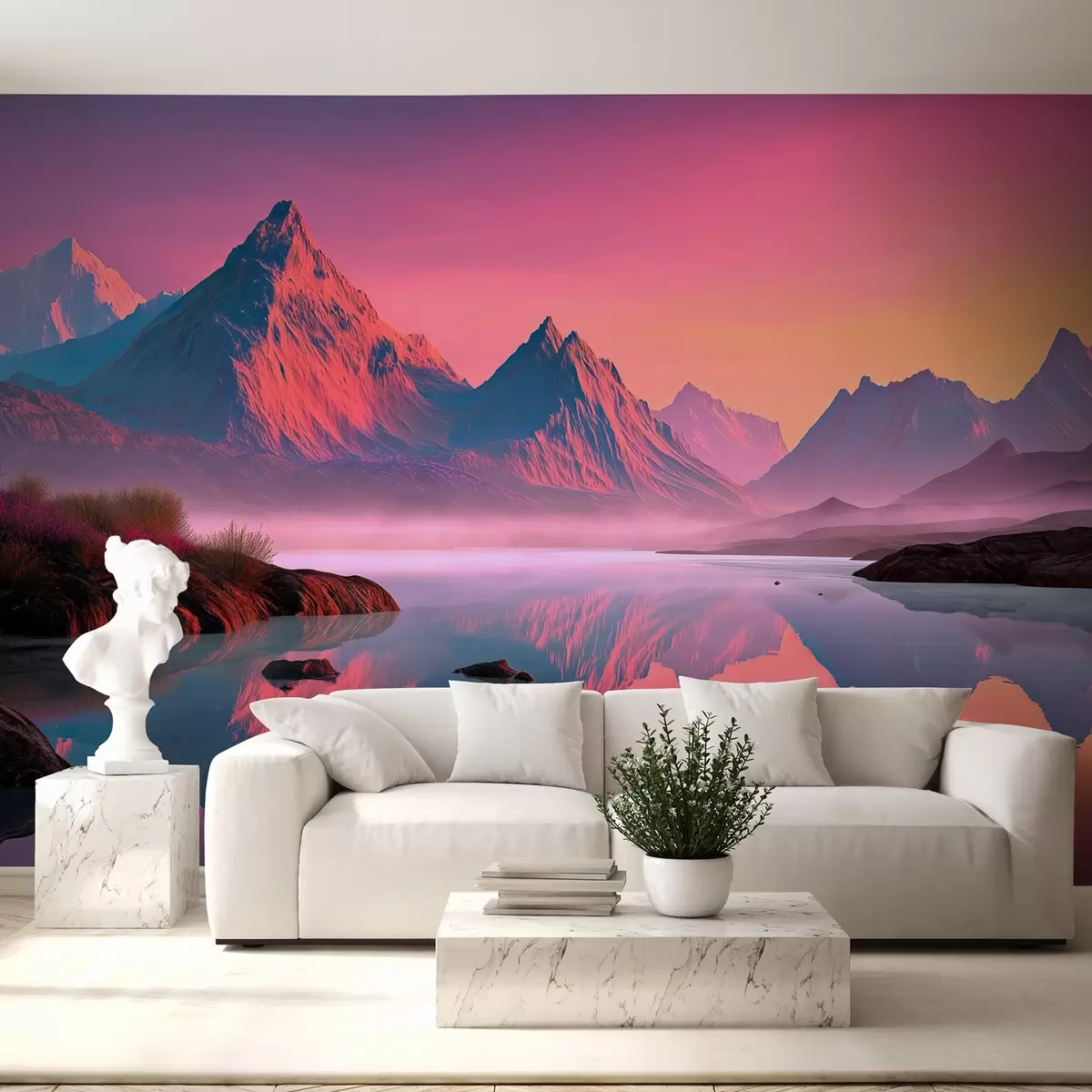 Fototapety Romantická krajina pri západe slnka s riekou a horami v ružových odtieňoch Nr. w09093