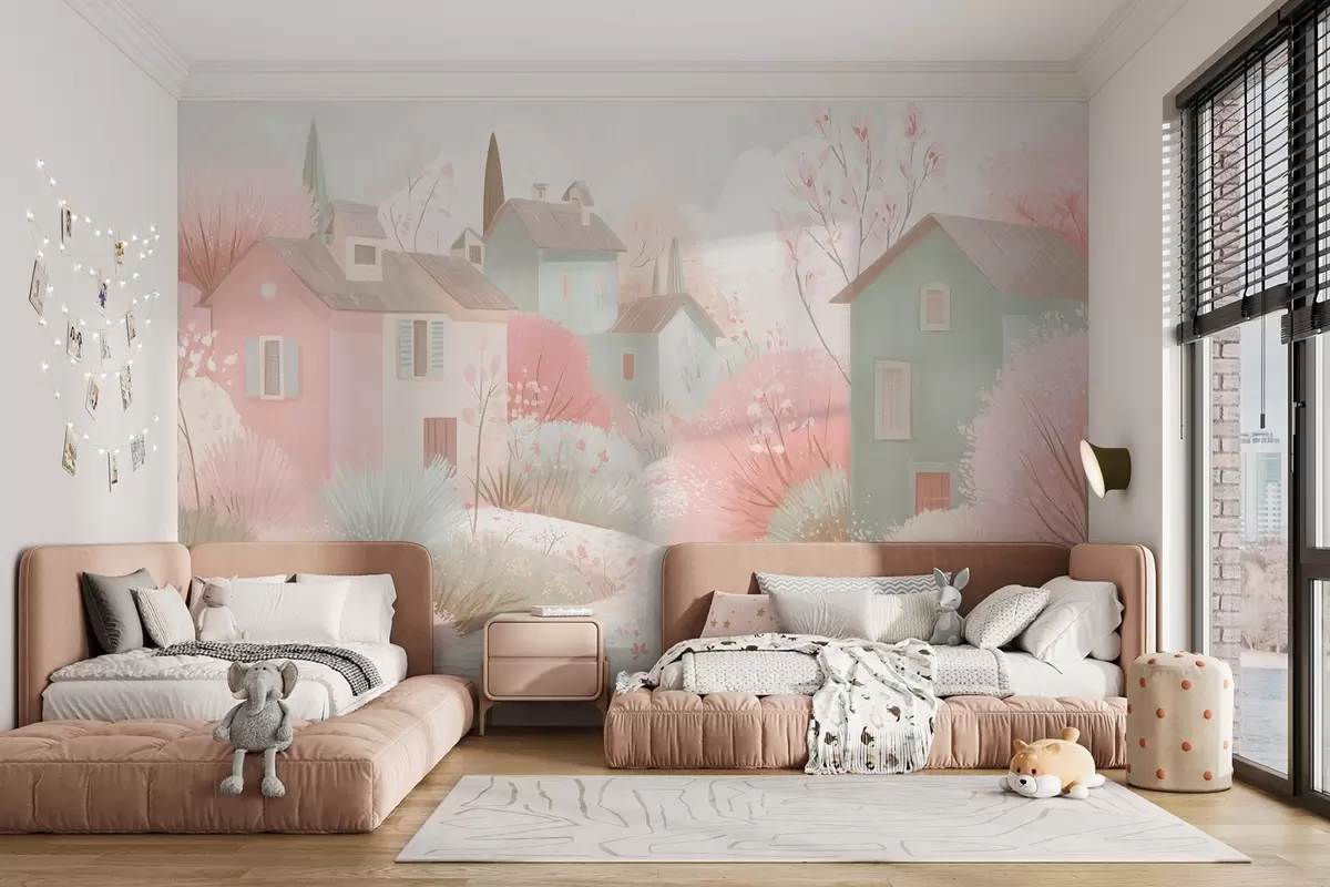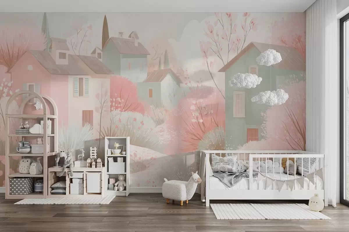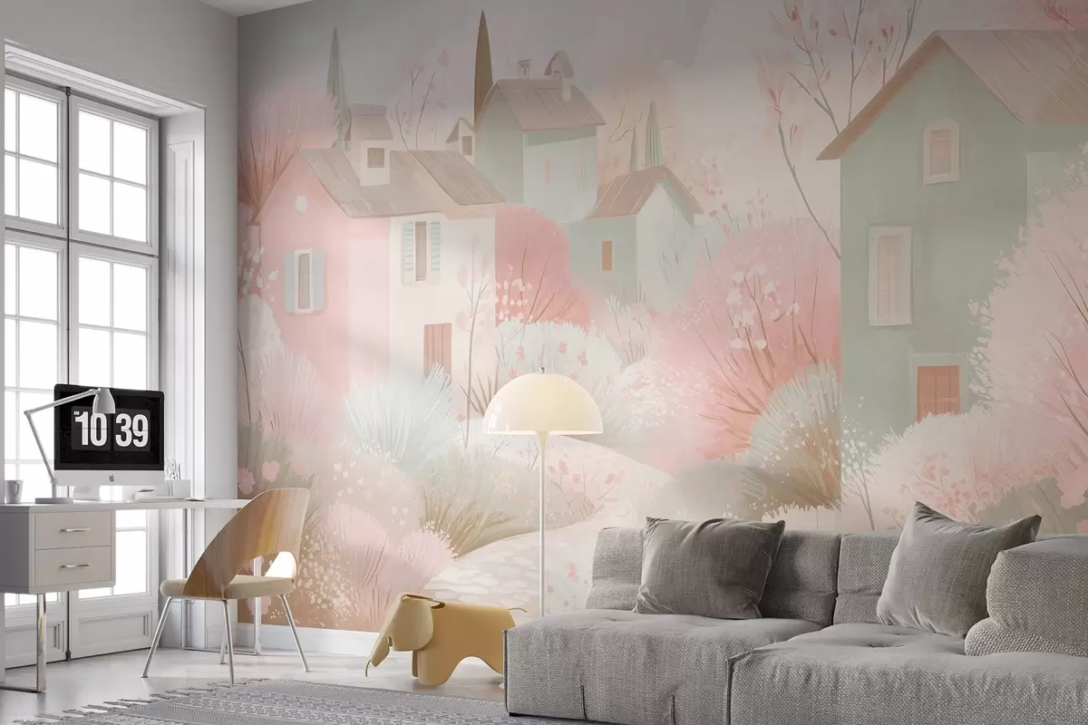 Fototapety Rozprávkové mesto v štýle olejomaľby v ružových odtieňoch Nr. w09095