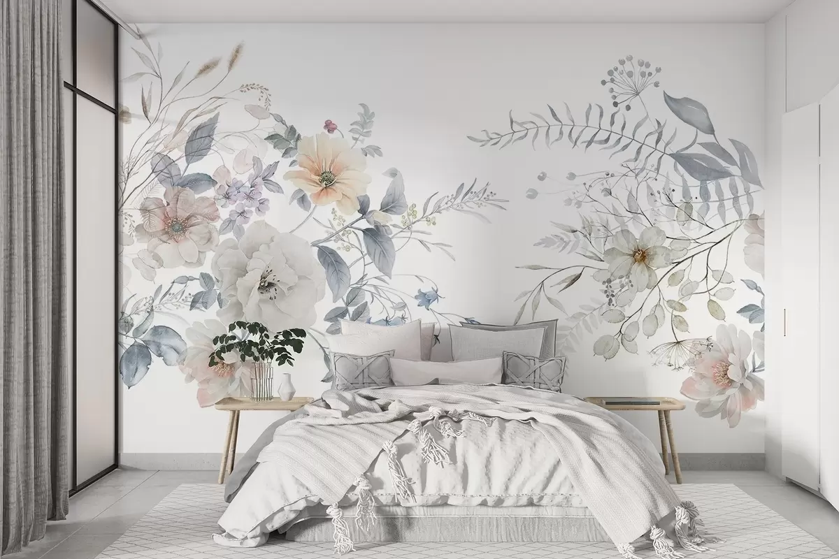 Fototapety Kvetinové aranžmá v štýle akvarelovej maľby s bielymi, broskyňovými a modrými kvetmi, jemnou zeleňou na bielom pozadí Nr. w09108