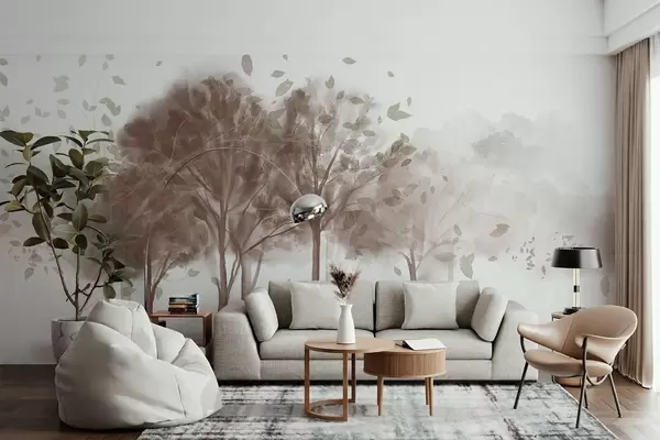 Fototapety Abstraktná krajina so stromami s hnedými listami odrážajúcimi sa vo vode, akvarelový textúrovaný štýl Nr. w09109v1