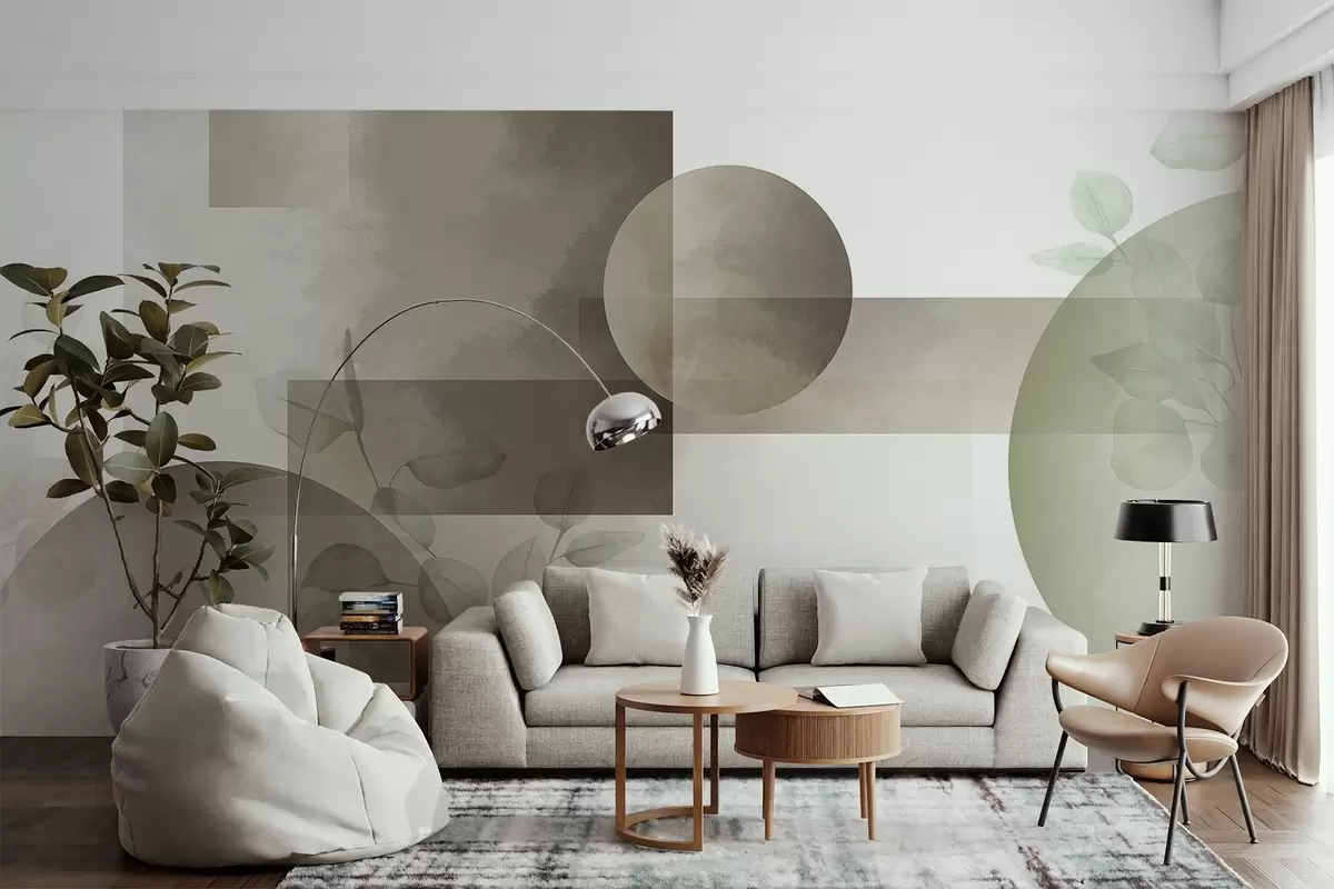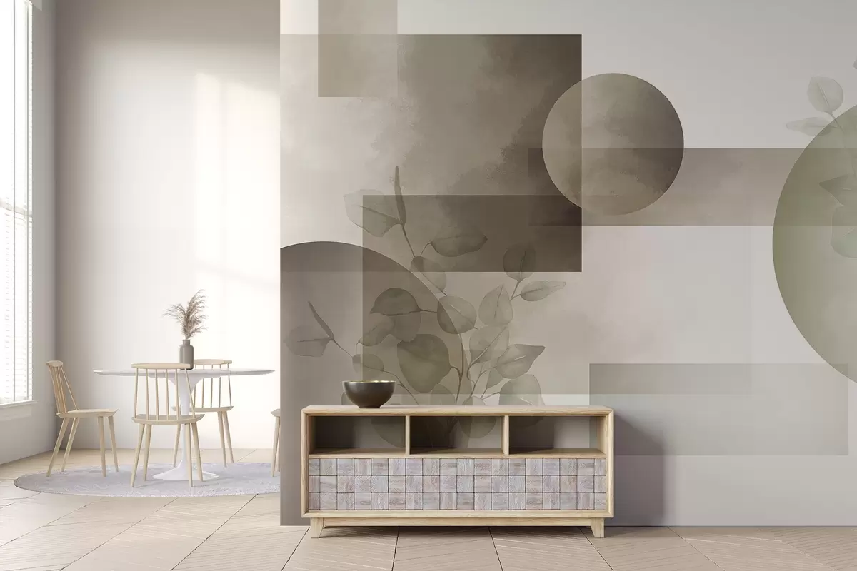 Fototapety Abstraktný moderný minimalistický geometrický dizajn s kruhmi a obdĺžnikmi, eukalyptové listy, akvarelový efekt Nr. w09110v1