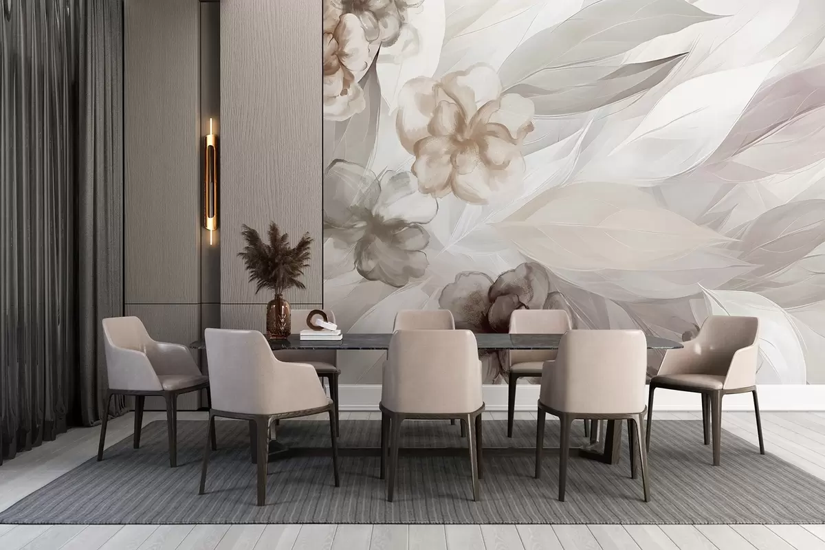 Fototapety Jemné kvety a listy v odtieňoch bielej, hnedej a béžovej farby na kvetinovom pozadí , jemné farby, jemné okvetné lístky Nr. w09111v1