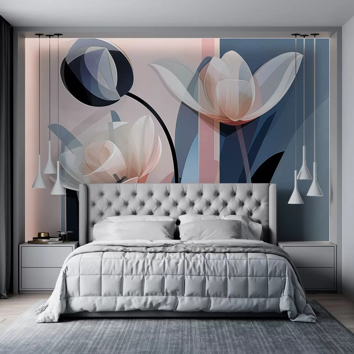 Fototapety Abstraktný moderný dizajn s tulipánmi s priehľadnými okvetnými lístkami v pastelových odtieňoch ružovej, bielej a tmavomodrej farby w09116