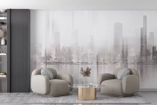 Fototapety Abstraktná textúrovaná mestská krajina s vysokými budovami a pásmi v odtieňoch sivej a bielej farby, ktoré vytvárajú hmlistý efekt Nr. w09119