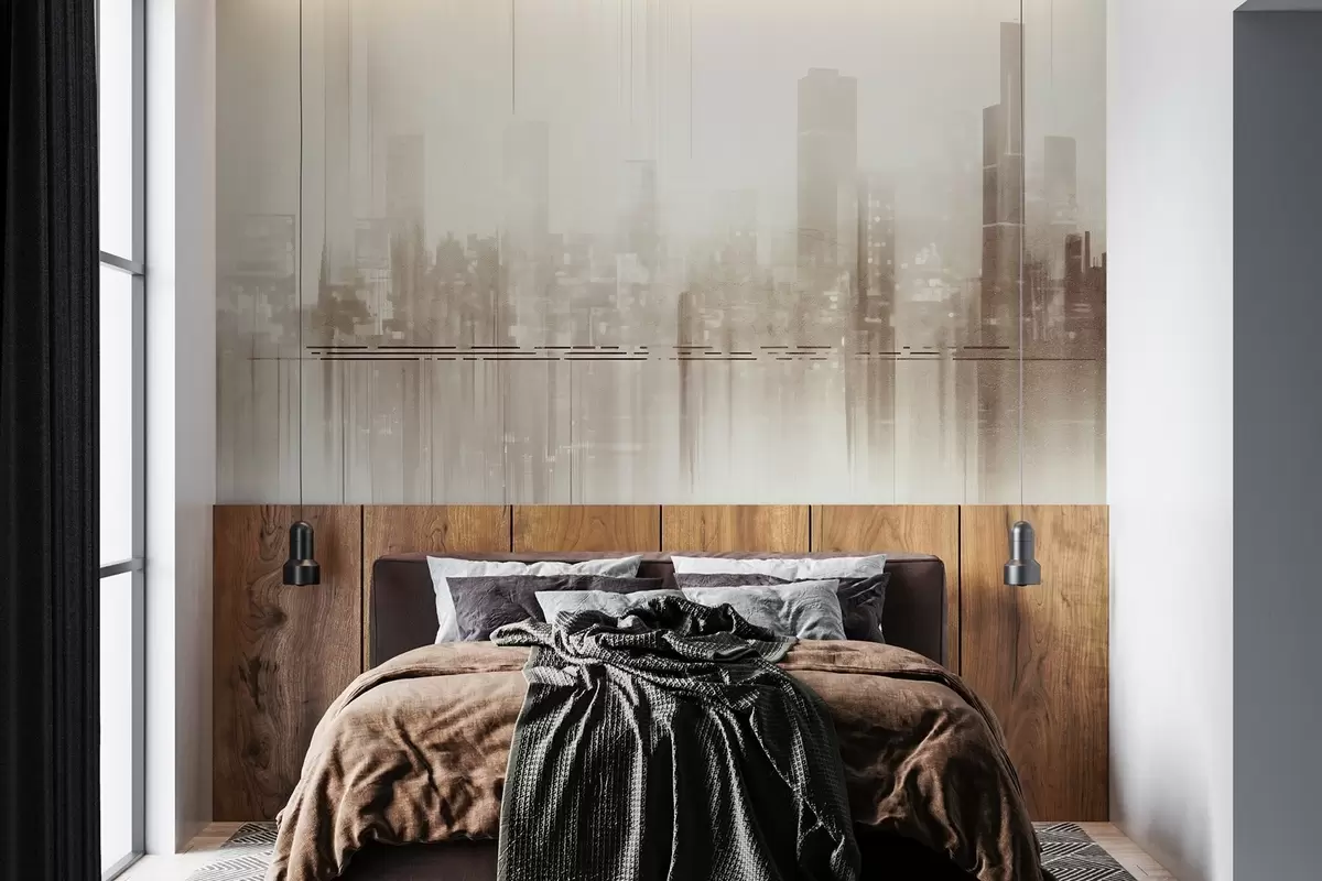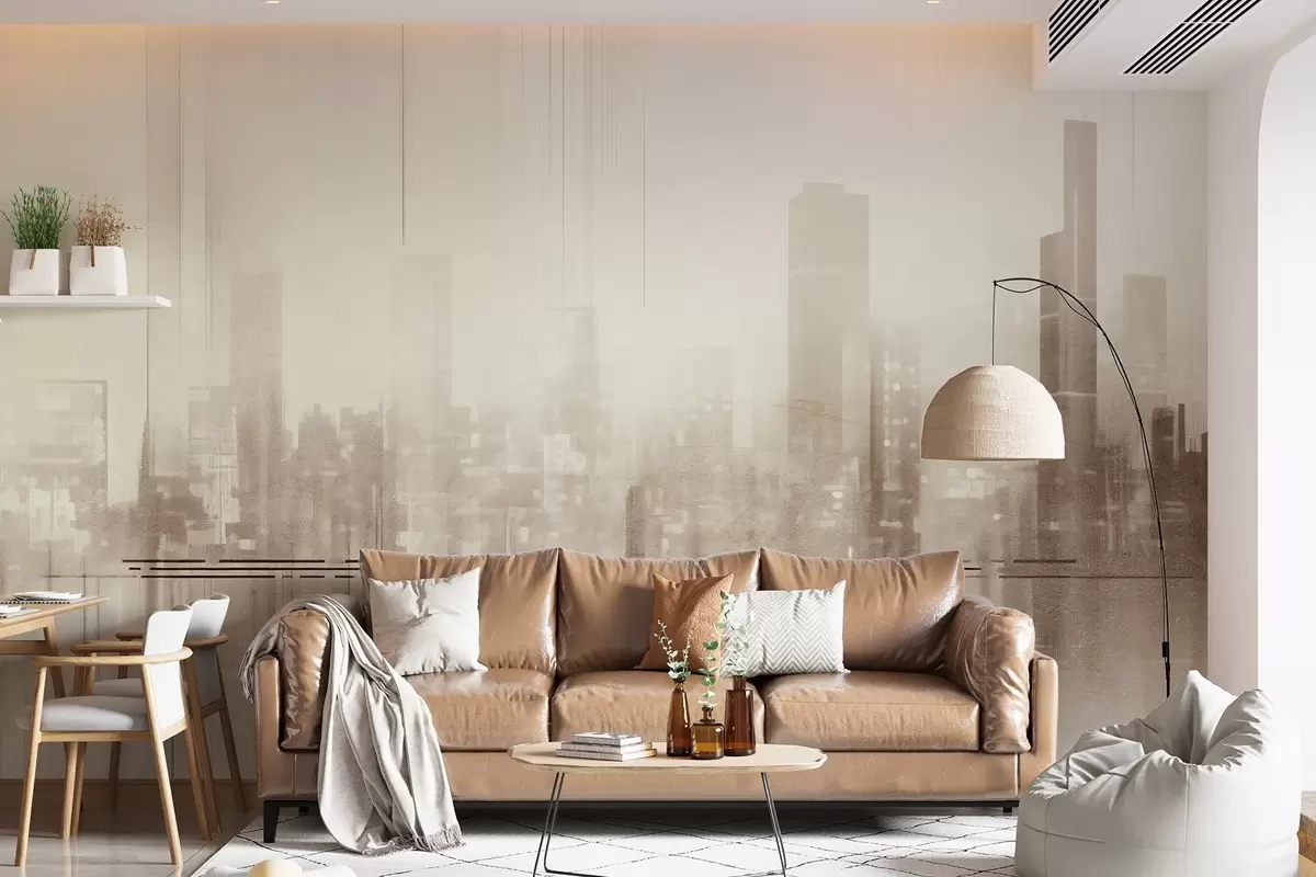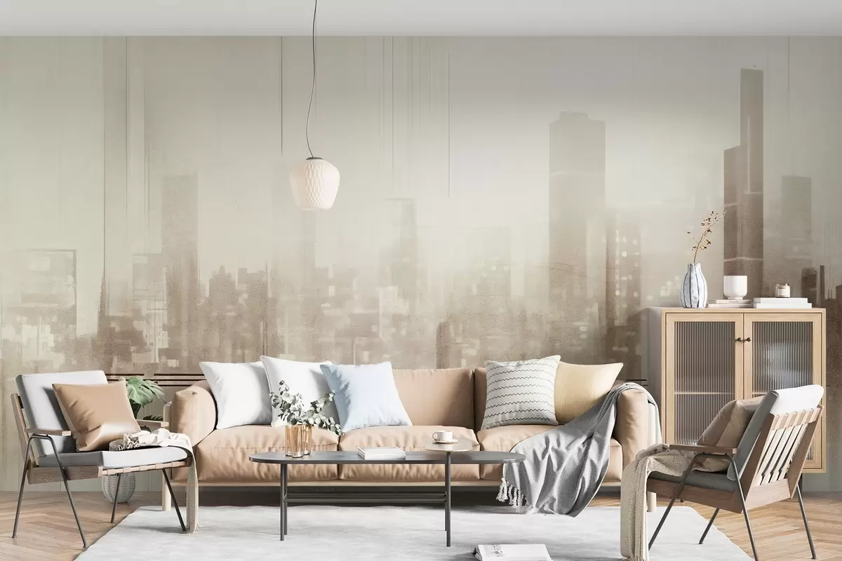 Fototapety Abstraktná textúrovaná mestská krajina s vysokými budovami a pásmi v odtieňoch béžovej a bielej farby, ktoré vytvárajú hmlistý efekt Nr. w09119v1