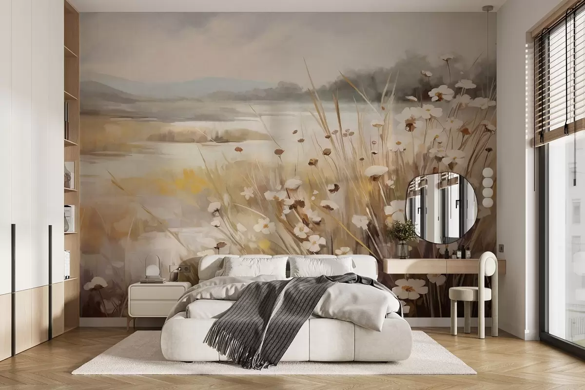 Fototapety Pole s vysokou trávou a bielymi sedmokráskami, stromy v pozadí, pod zamračenou oblohou, textúrovaná krajina, jemné ťahy štetcom Nr. w09139