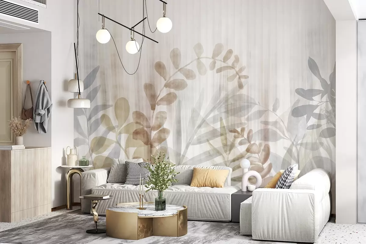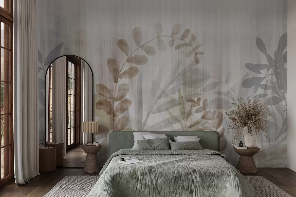 Fototapety Akvarelová maľba imitujúca rastliny s viacfarebnými tlmenými listami, svetlé pozadie so zvislými líniami, botanická ilustrácia Nr. w09146