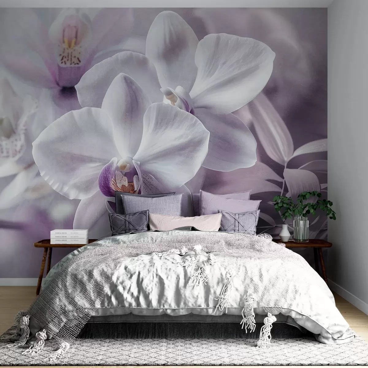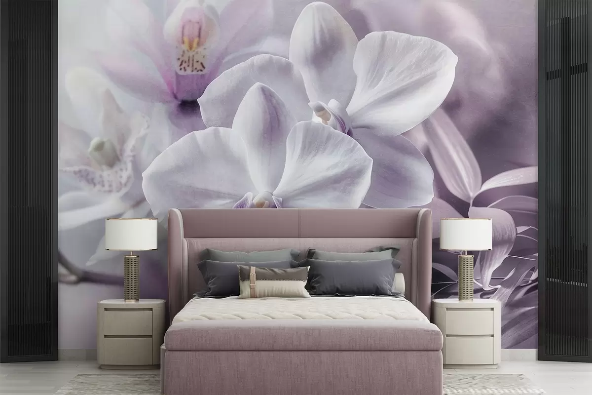 Fototapety Biele a lila jemné kvety orchideí, jemné osvetlenie a rozmazané textúrované pozadie Nr. w09155