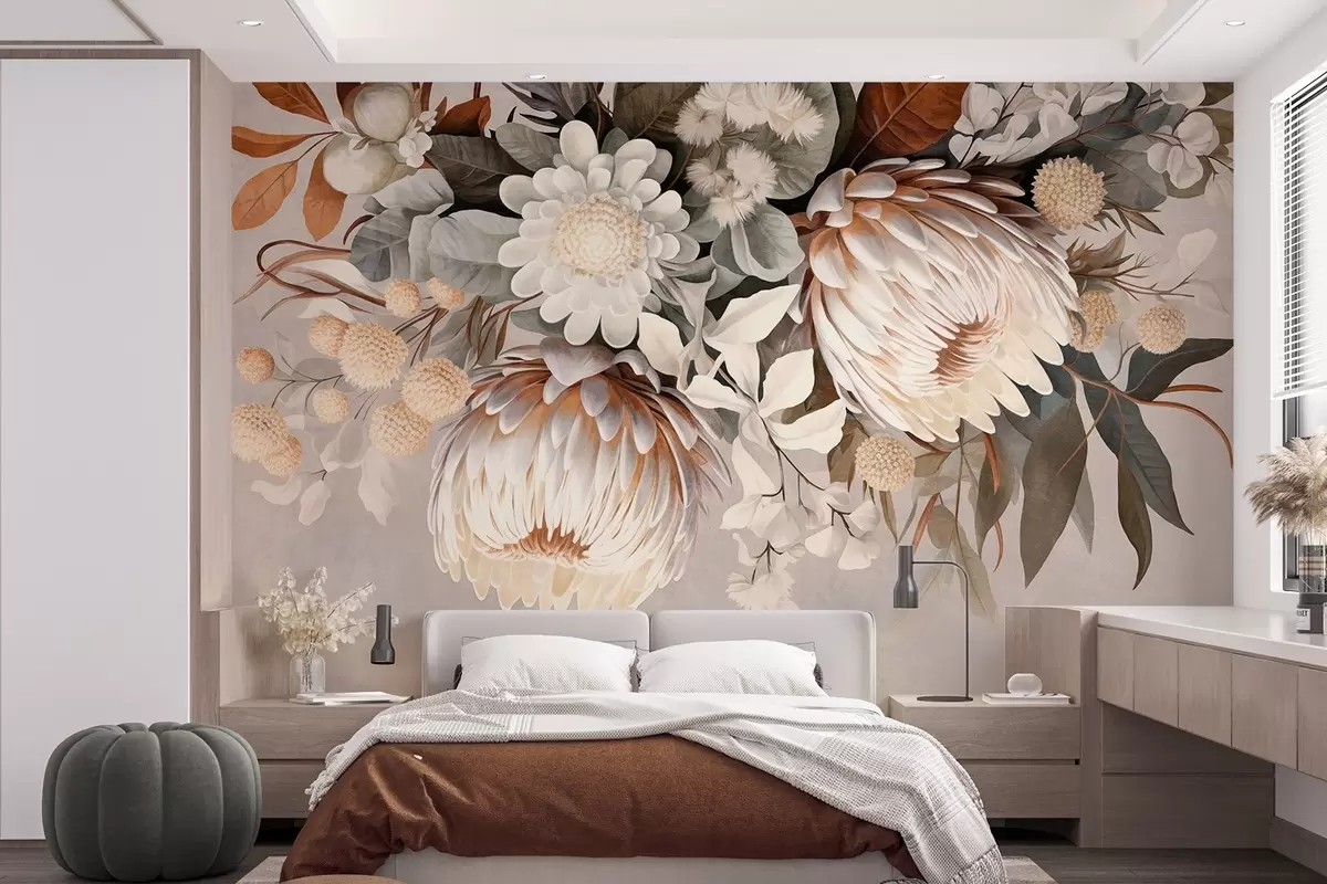 Fototapety Veľká textúrovaná protea s hnedými akcentmi, bielymi sedmokráskami a žltými kvetmi, béžové tlmené pozadie Nr. w09157