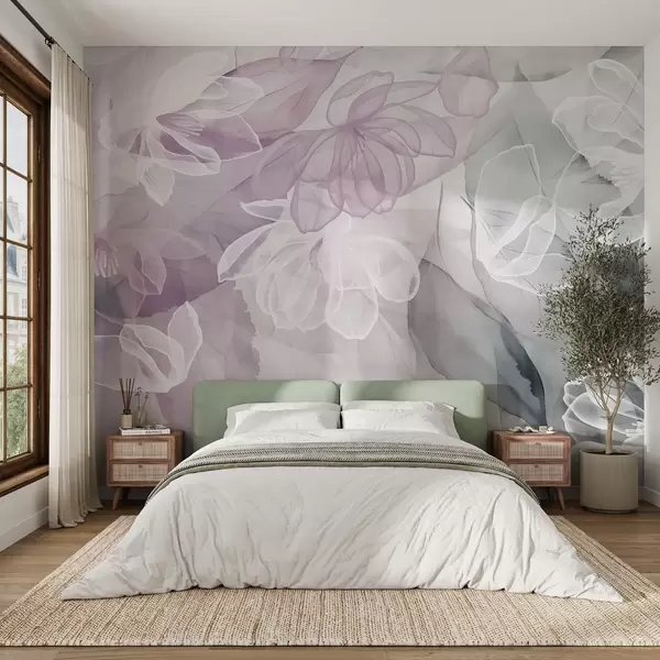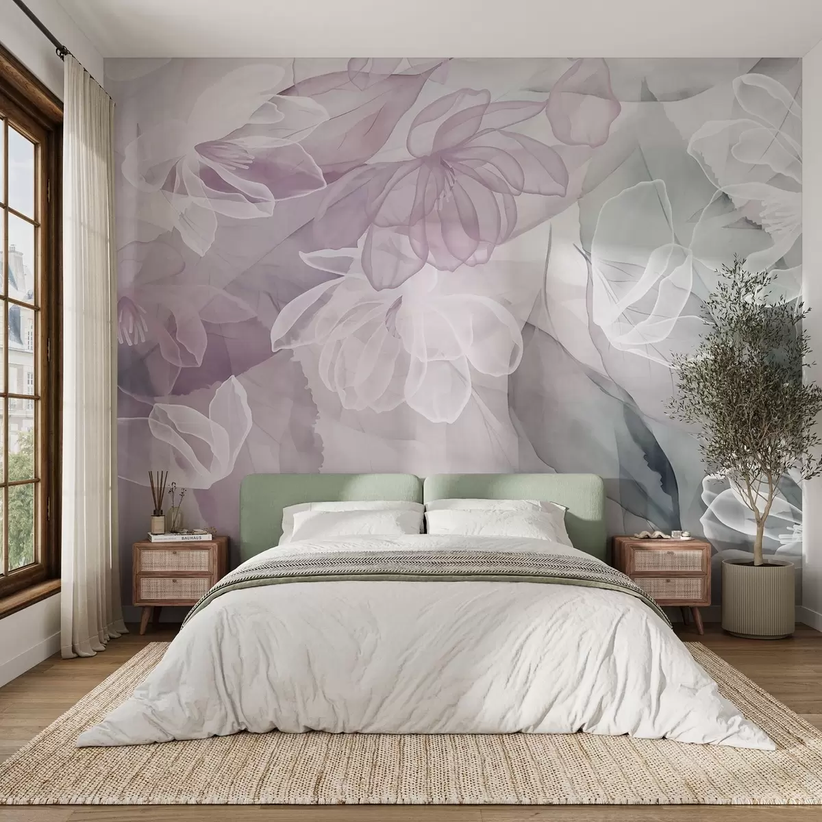 Fototapety Kvety a listy s priehľadnými okvetnými lístkami v odtieňoch bielej, ružovej a zelenej, mäkké a jemné Nr. w09158v1