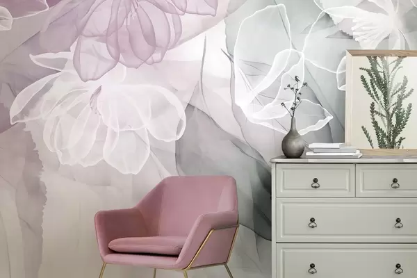 Fototapety Kvety a listy s priehľadnými okvetnými lístkami v odtieňoch bielej, ružovej a zelenej, mäkké a jemné Nr. w09158v1