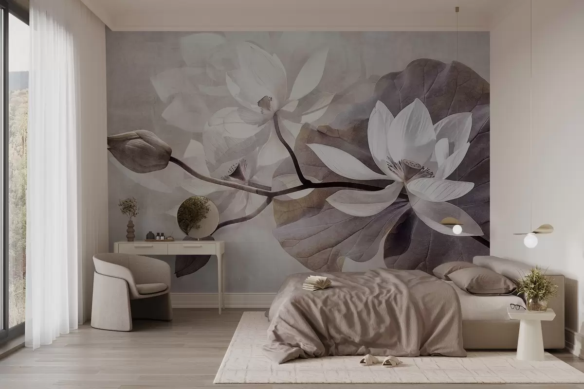 Fototapety Zrnitá textúra tlmených jemných lotosových kvetov s listami a stonkami v jemnej béžovej farebnej palete Nr. w09159