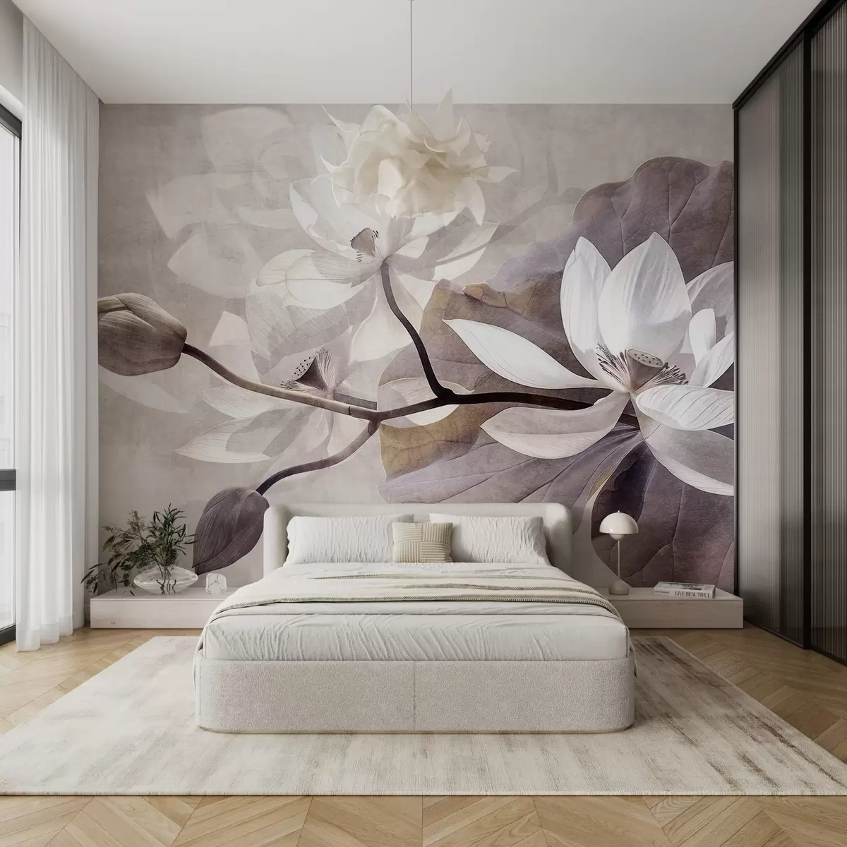 Fototapety Zrnitá textúra tlmených jemných lotosových kvetov s listami a stonkami v jemnej béžovej farebnej palete Nr. w09159