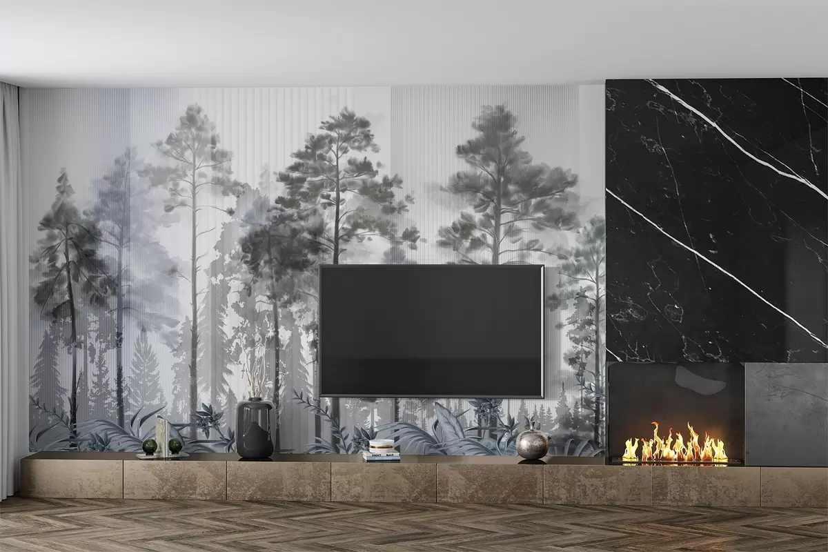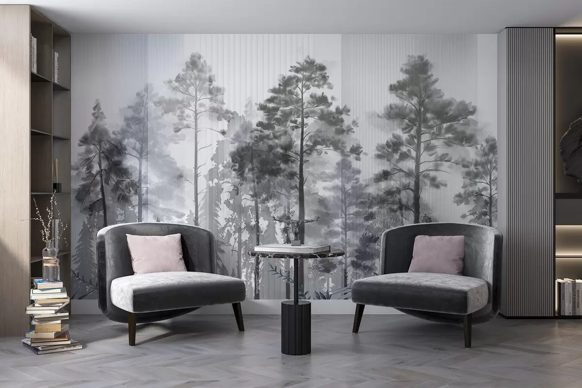 Fototapety Hustý les s vysokými borovicami, sviežim sivým lístím, hmlistou atmosférou s textúrami vertikálnych línií Nr. w09163v2