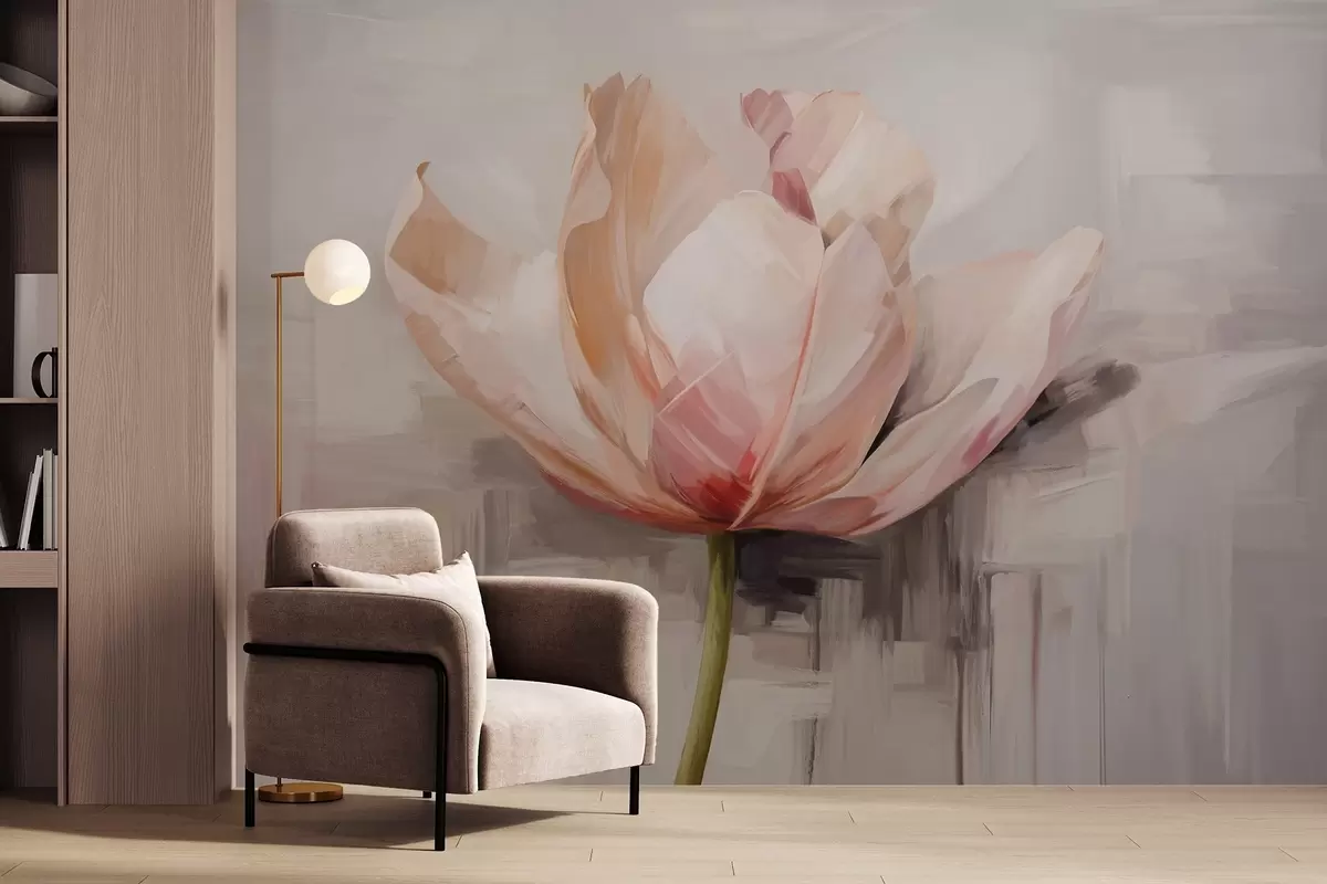 Fototapety Ružový tulipán, imitácia olejomaľby s jemnými ťahmi štetca, abstraktné pozadie s pastelovými odtieňmi sivej a béžovej Nr. w09187