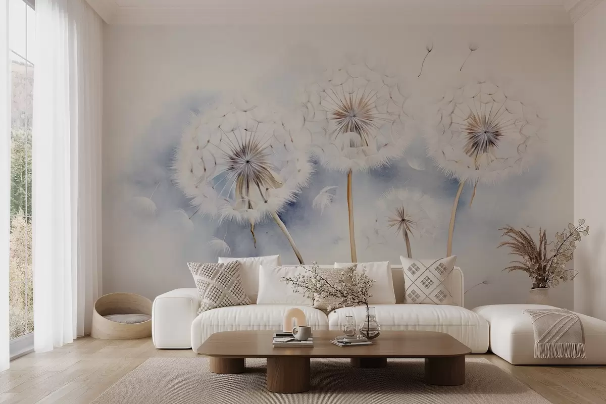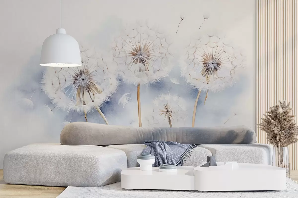 Fototapety Textúrované púpavy so semienkami vznášajúcimi sa vo vzduchu, svetlomodré a biele pozadie, jemný štýl kresby Nr. w09190