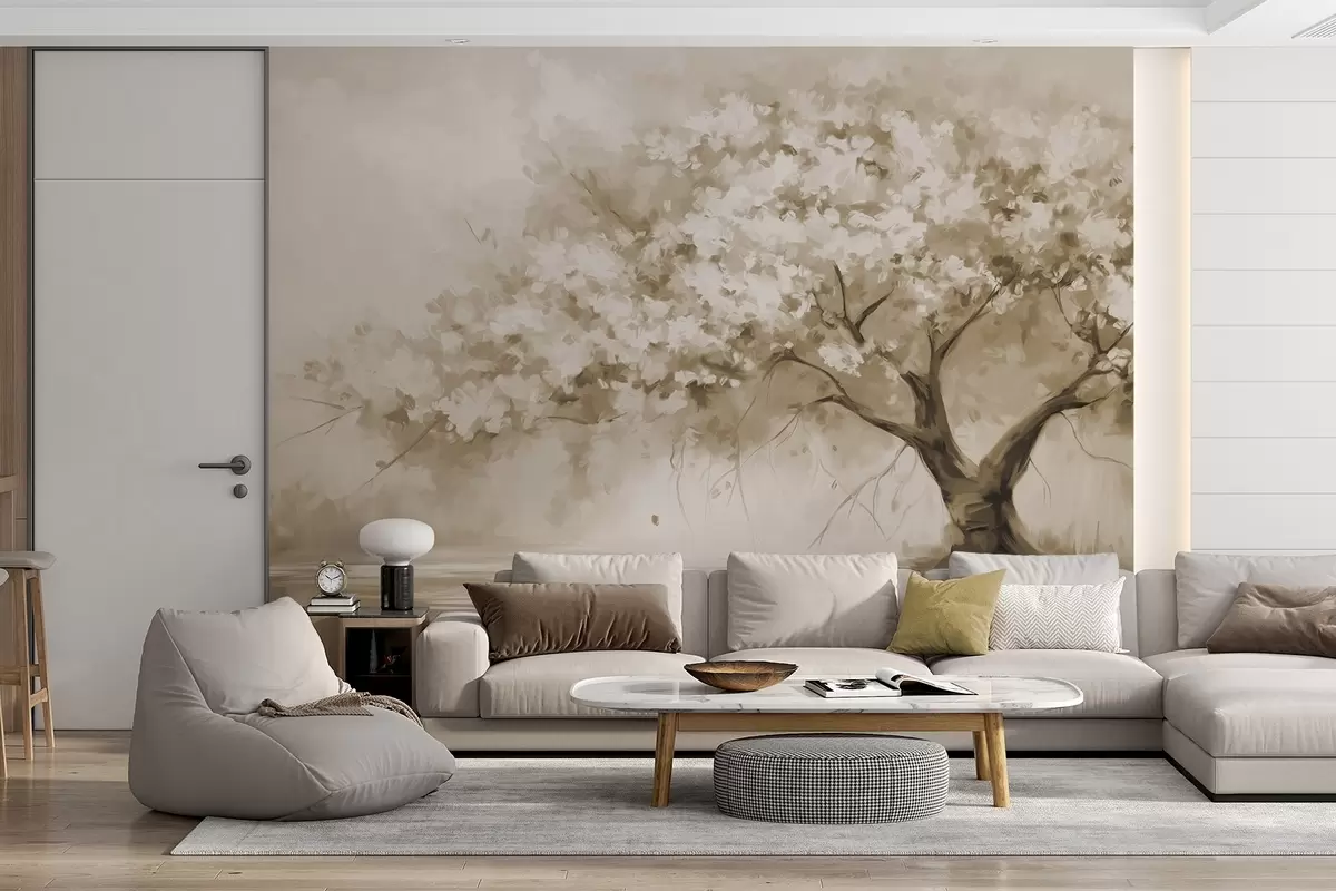 Fototapety Abstraktný béžový rozkvitnutý strom v plnom kvete, vedľa rieky, jemné textúrované ťahy štetcom a pastelové farby Nr. w09193v1