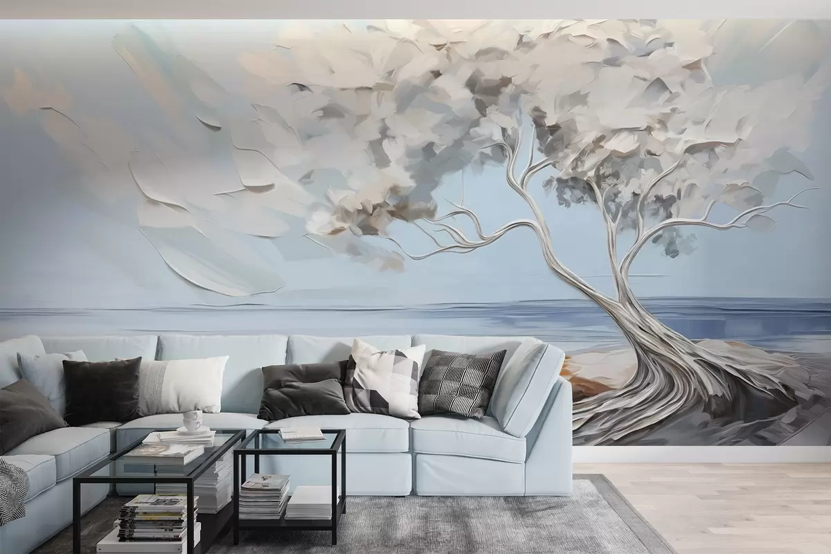 Fototapety Biely strom s hustými a štruktúrovanými listami na piesočnatej pláži, krajina so svetlomodrou oblohou Nr. w09205