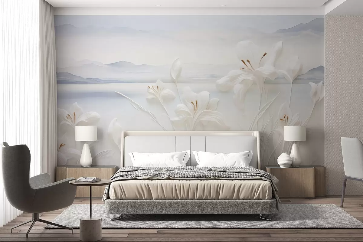 Fototapety Biele ľalie s dlhými stonkami a listami, hory a jazero v pozadí, minimalistická krajinná kompozícia Nr. w09206