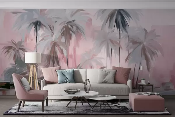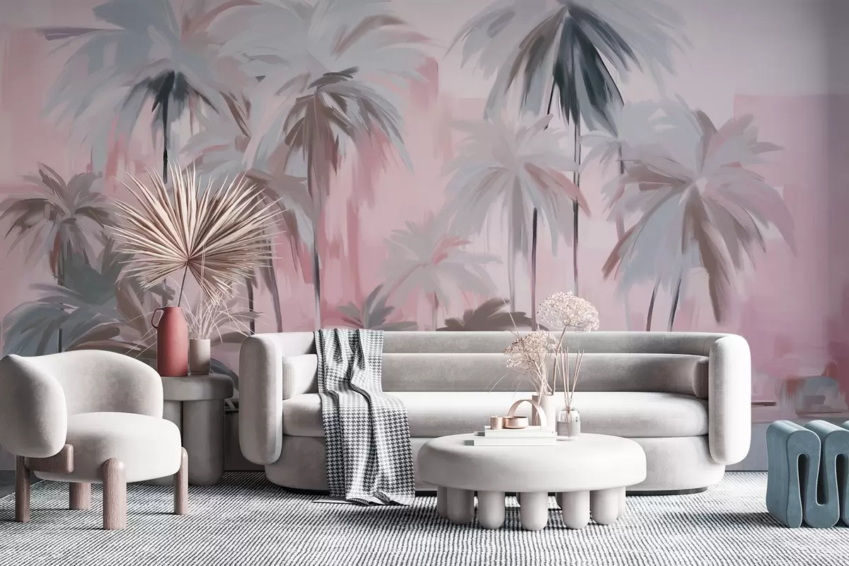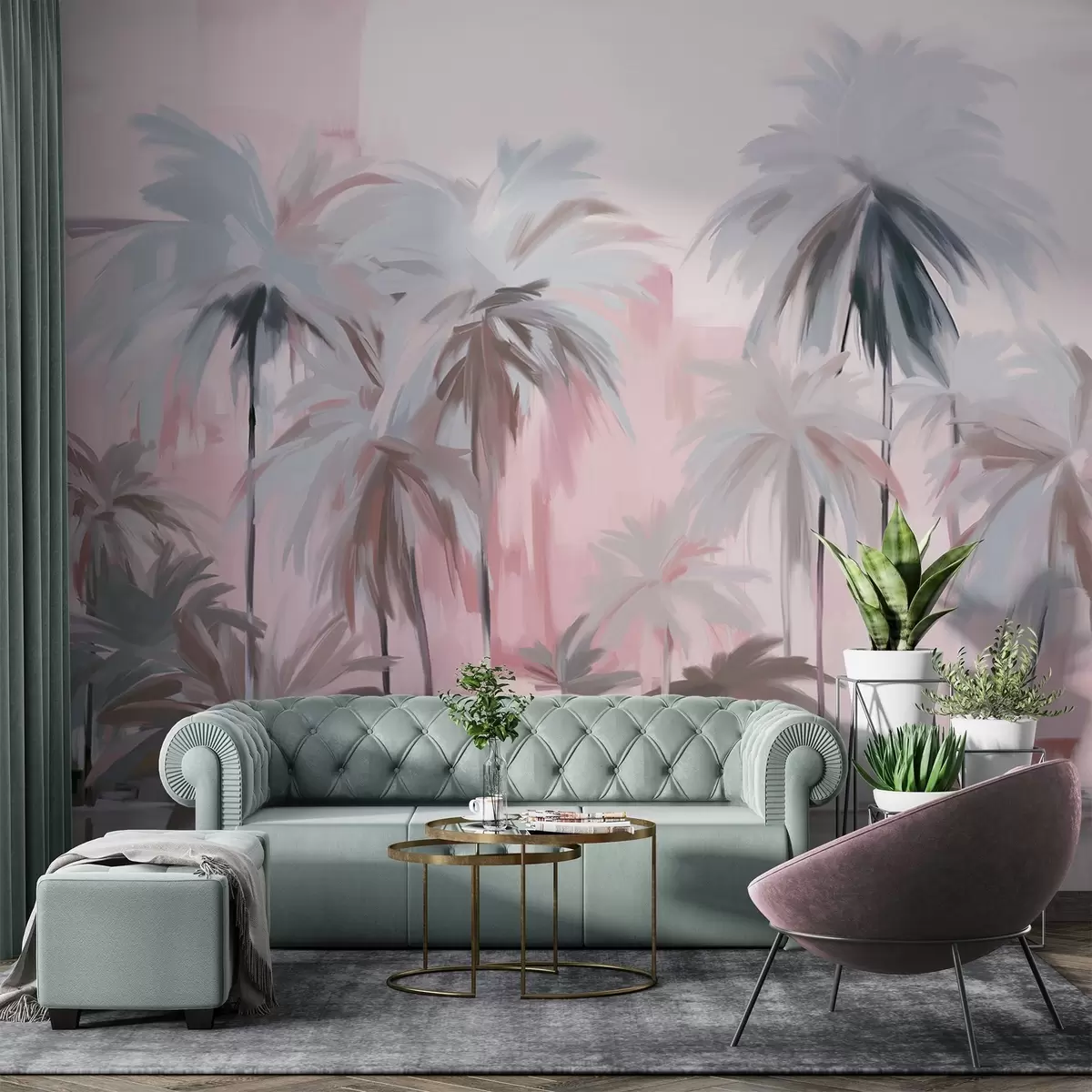 Fototapety Abstraktné minimalistické pastelové tropické palmy na pozadí tlmených ružových a sivých odtieňov Nr. w09212v1