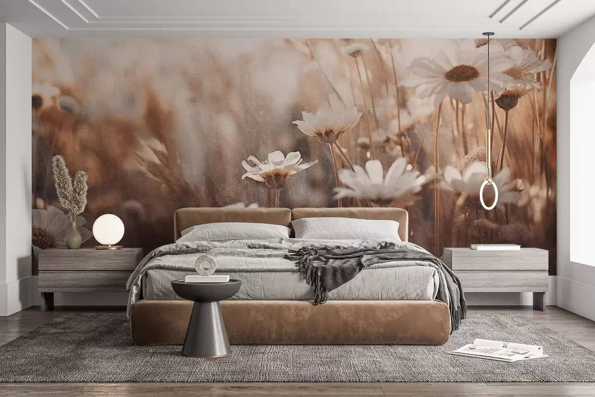 Fototapety Textúrované pole bielych sedmokrások a poľných kvetov v teplej farebnej palete s rozmazaným pozadím Nr. w09214