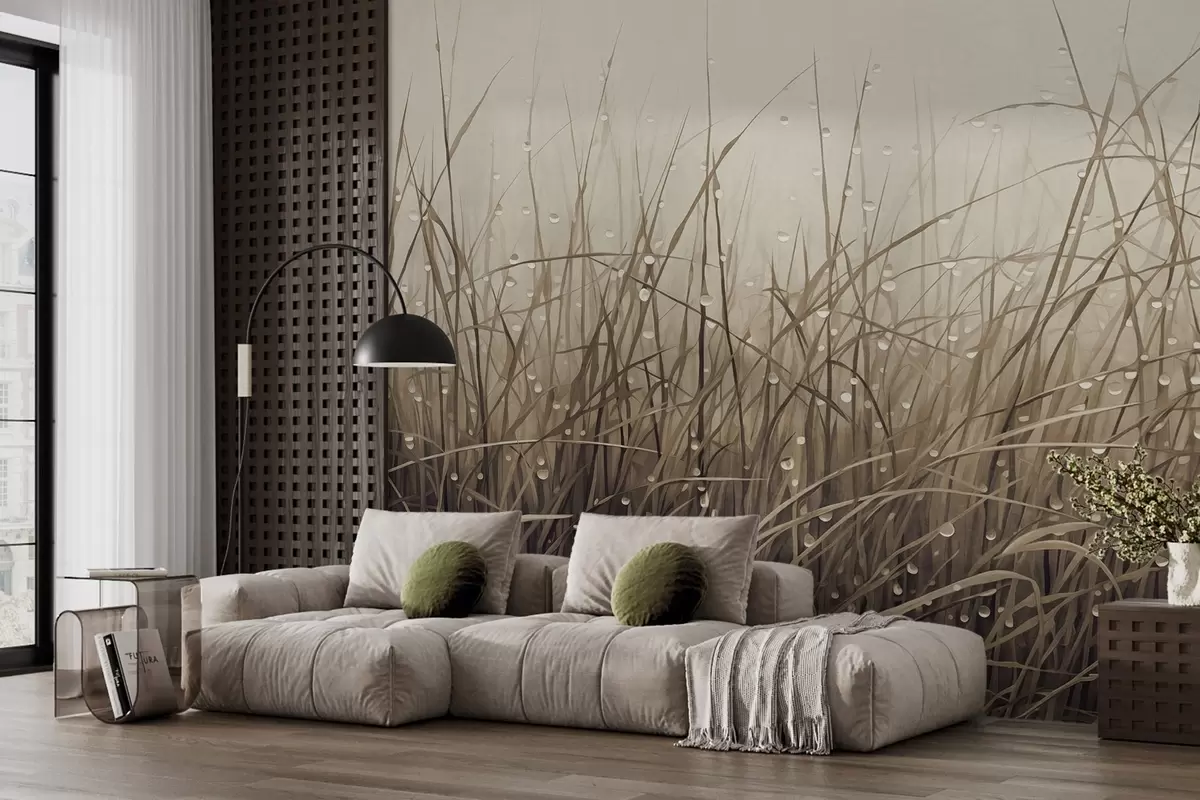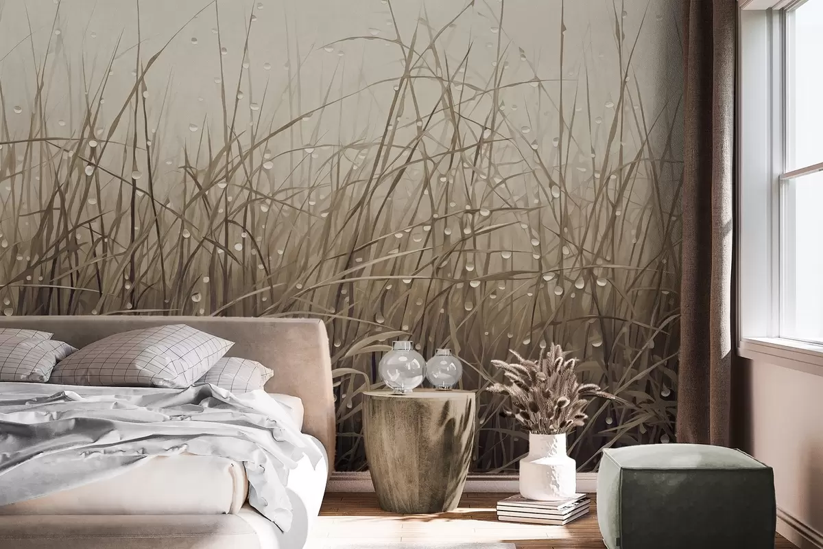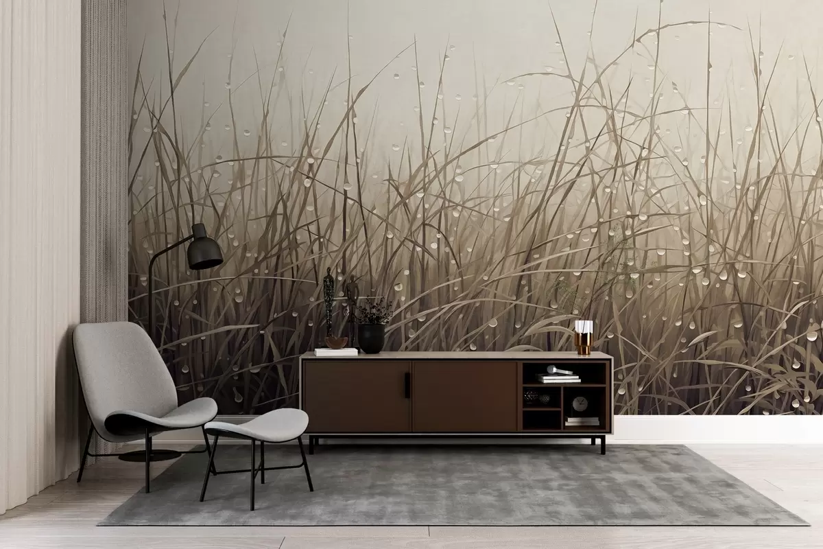 Fototapety Tráva s kvapkami vody, tlmené hnedé odtiene, mäkké svetlo, hmlisté pozadie, abstraktný minimalistický textúrovaný štýl Nr. w09217v1