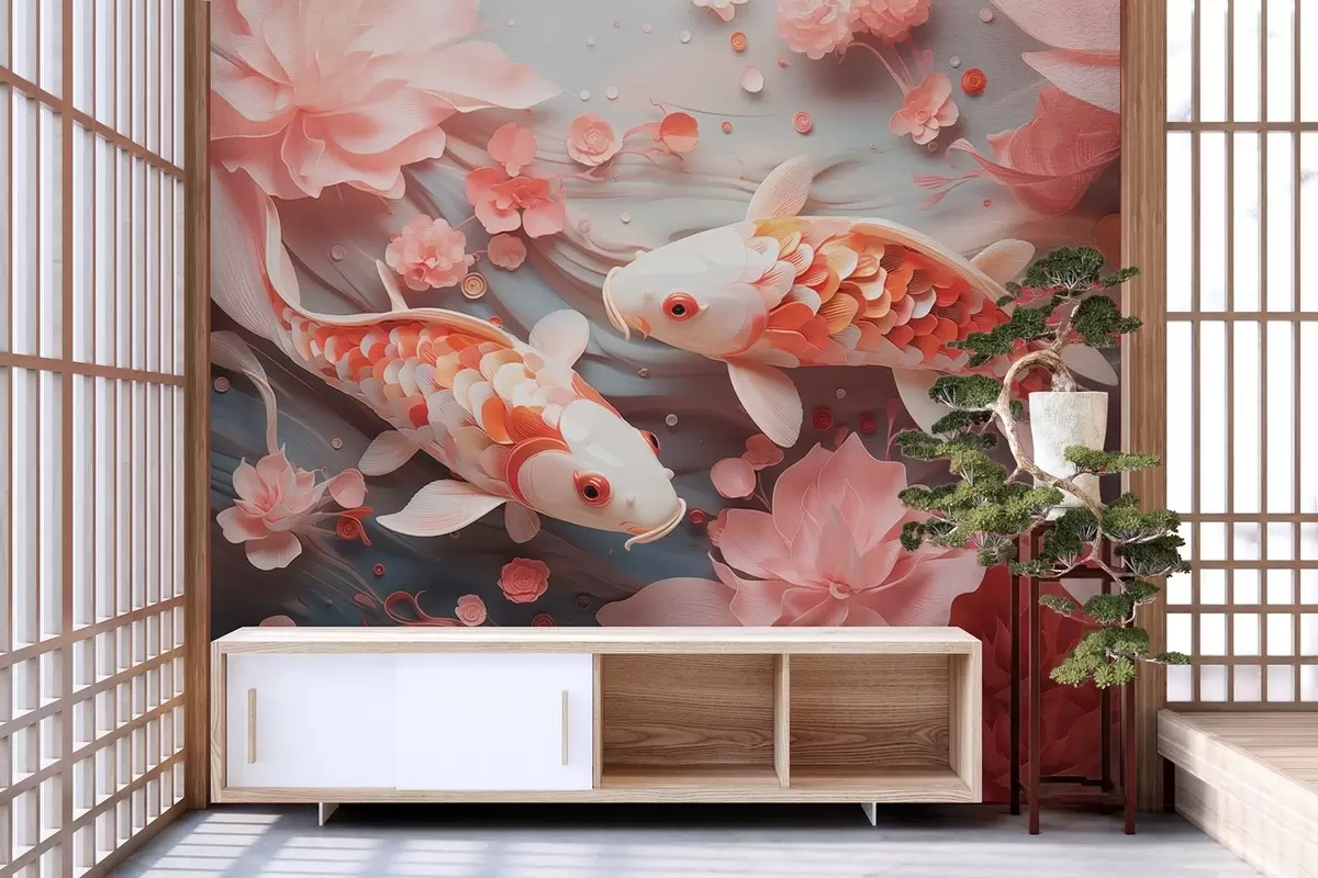 Fototapety Jemné rybky s rozmernými šupinami plávajú v prúde okvetných lístkov a jemných ružových tónov Nr. w09237