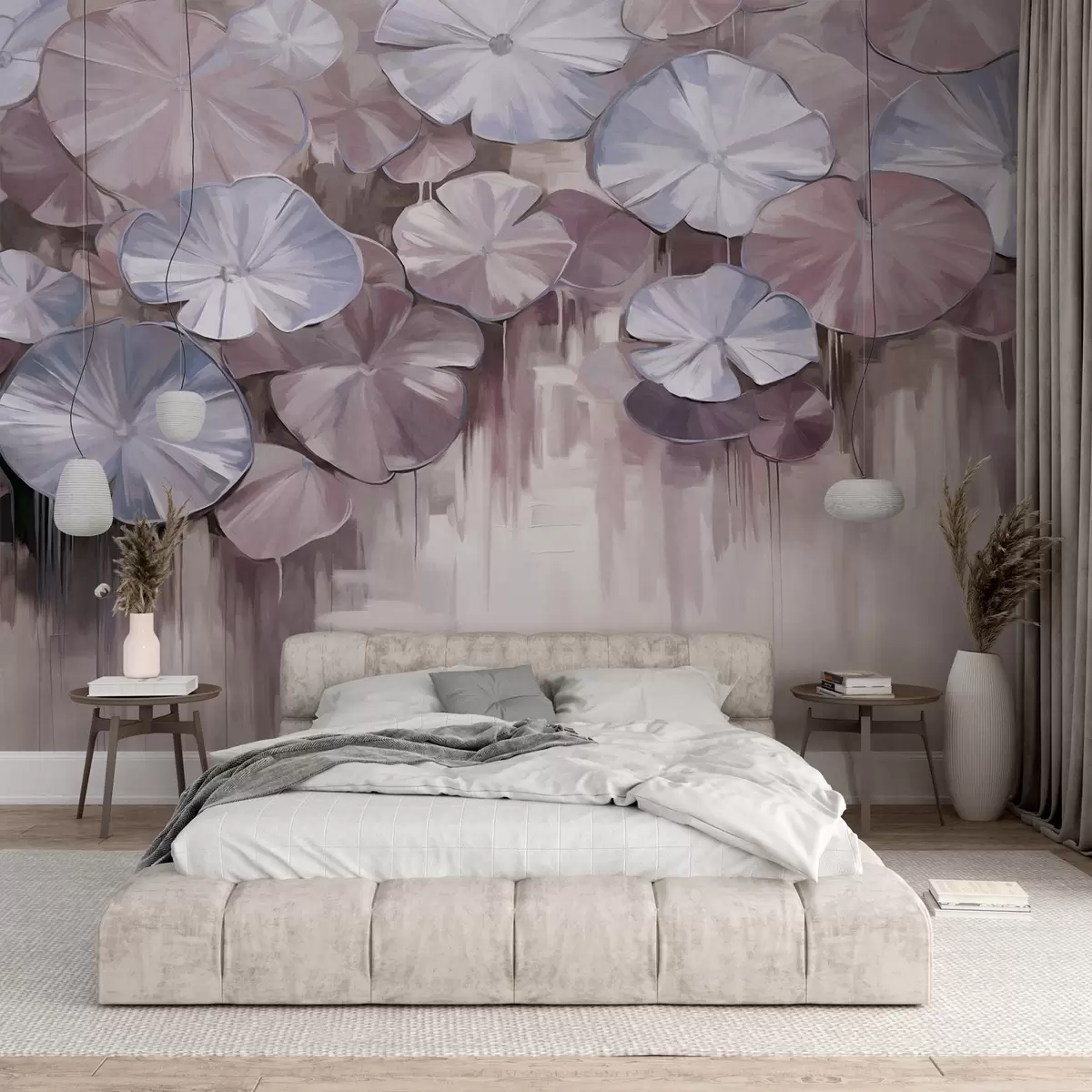 Fototapety Textúrované lekná s fialovými a modrými farbami v rybníku, pozadie je rozmazaná zmes jemných odtieňov fialovej Nr. w09255v1